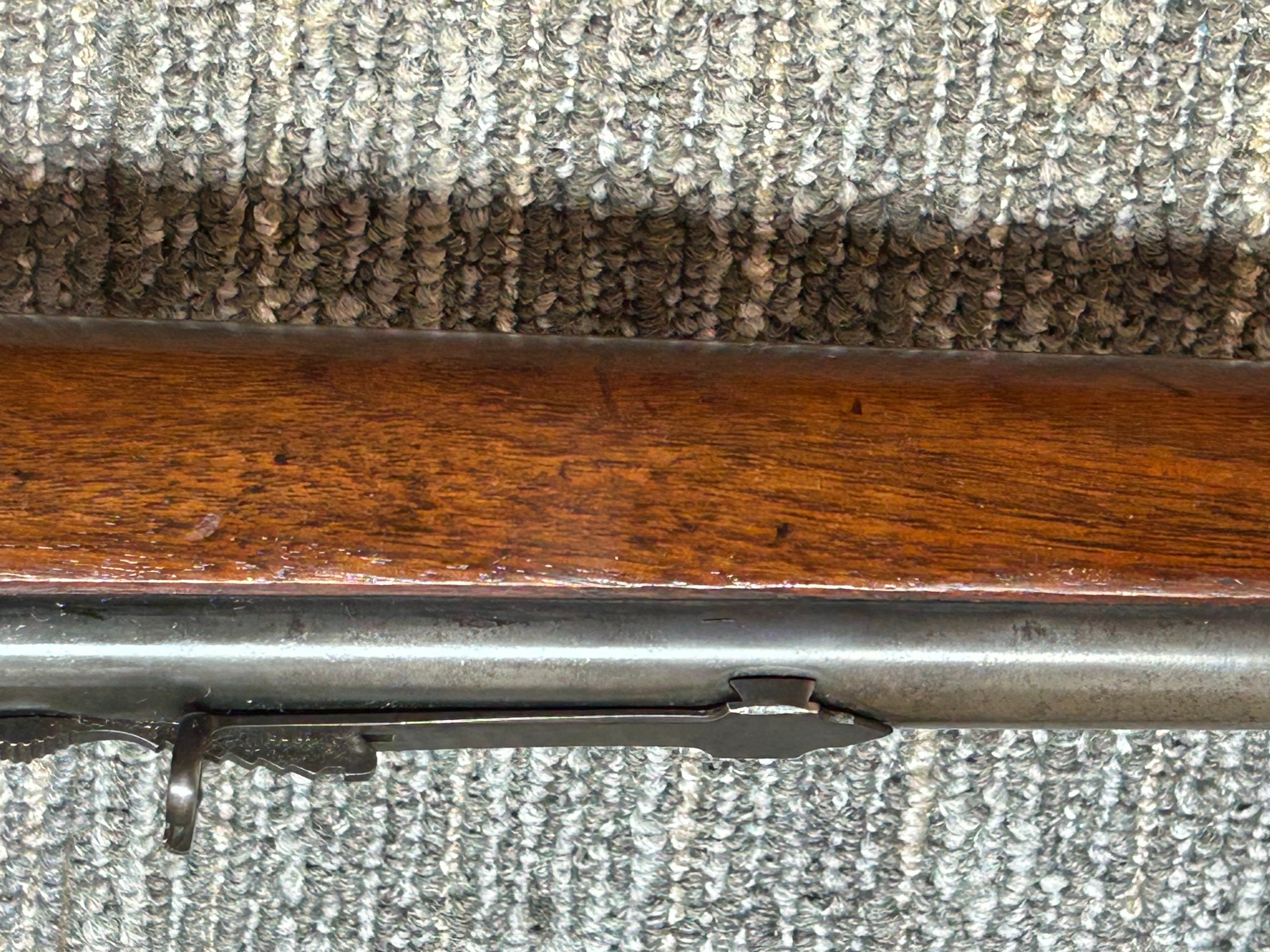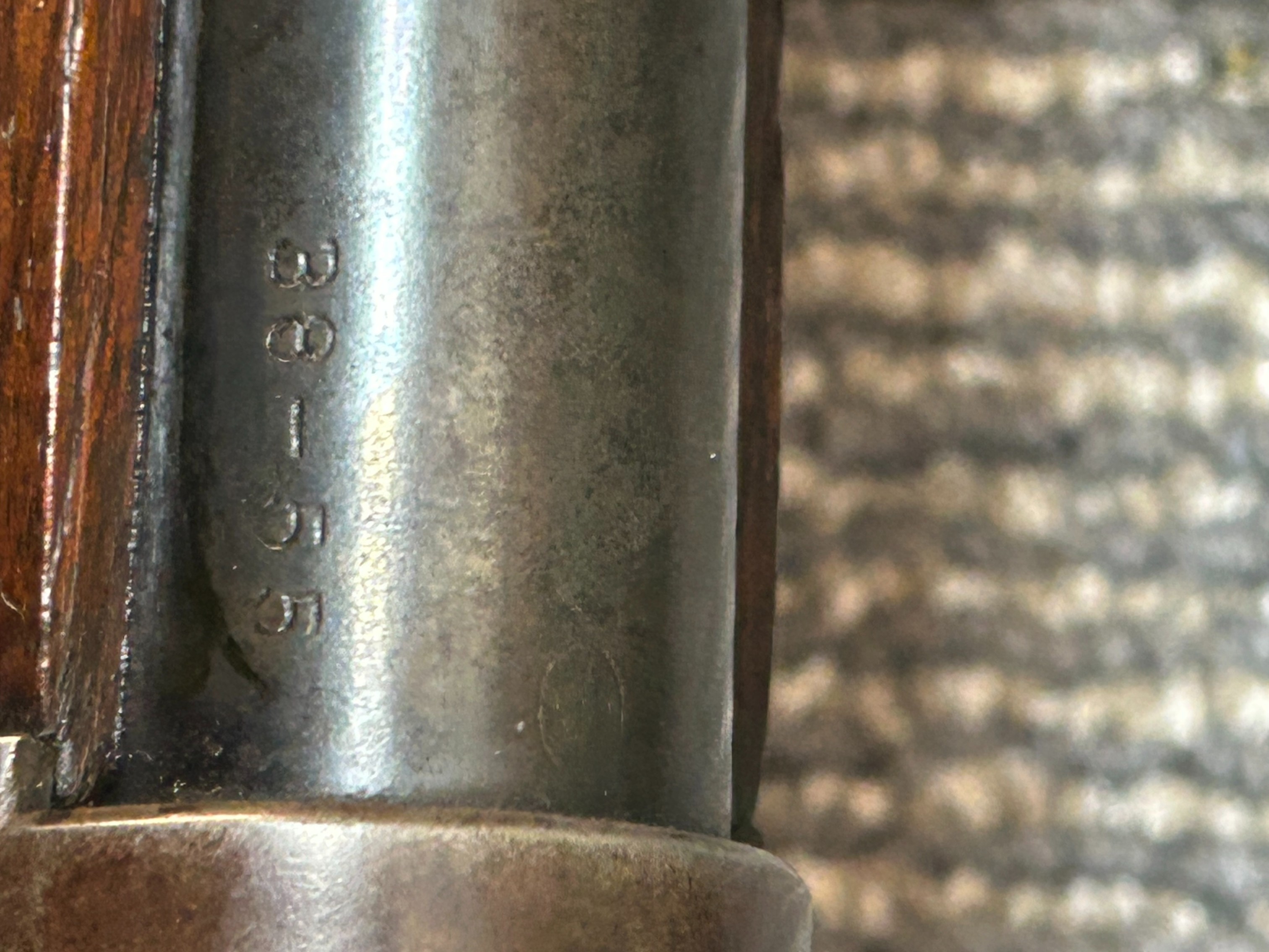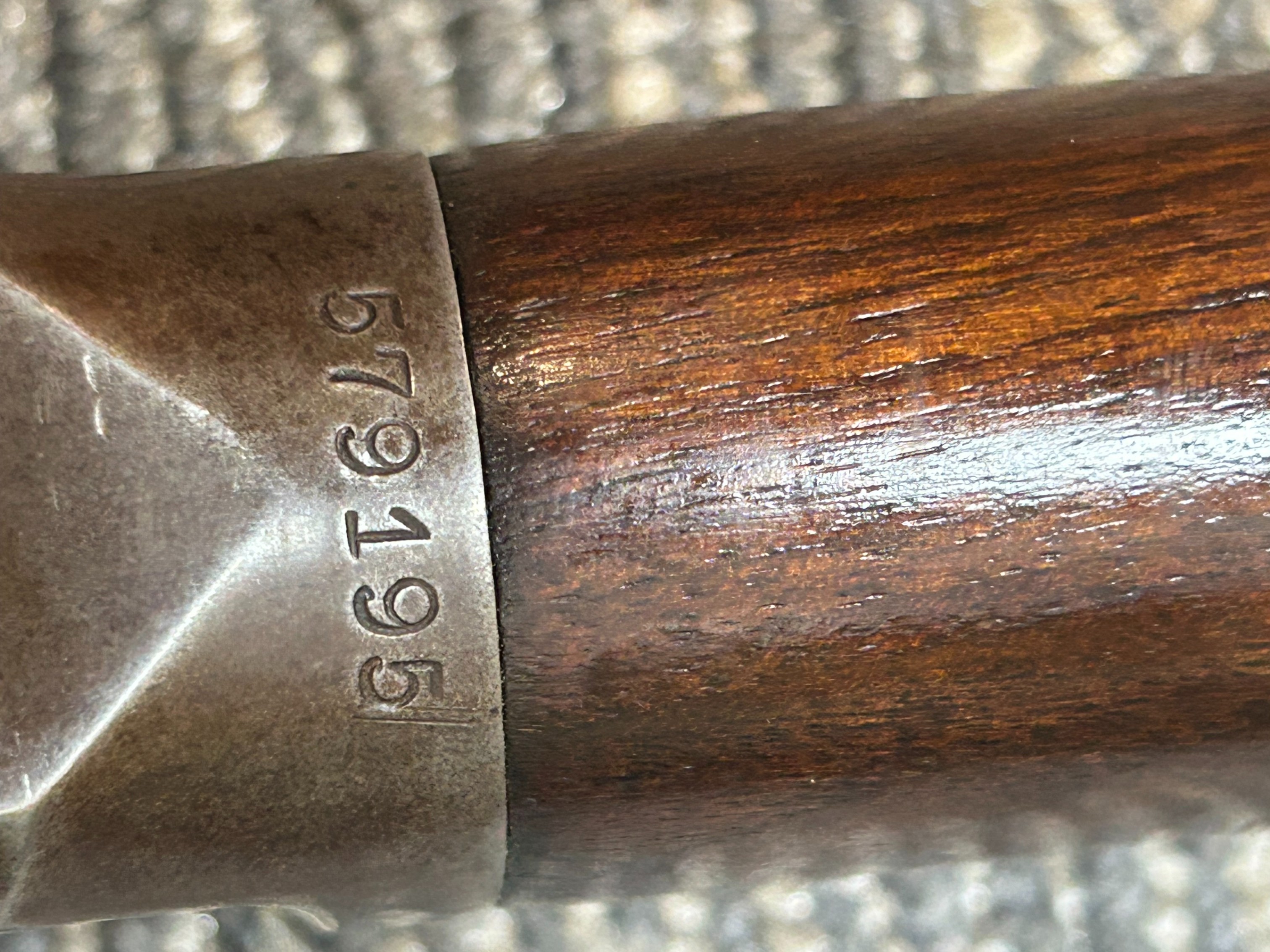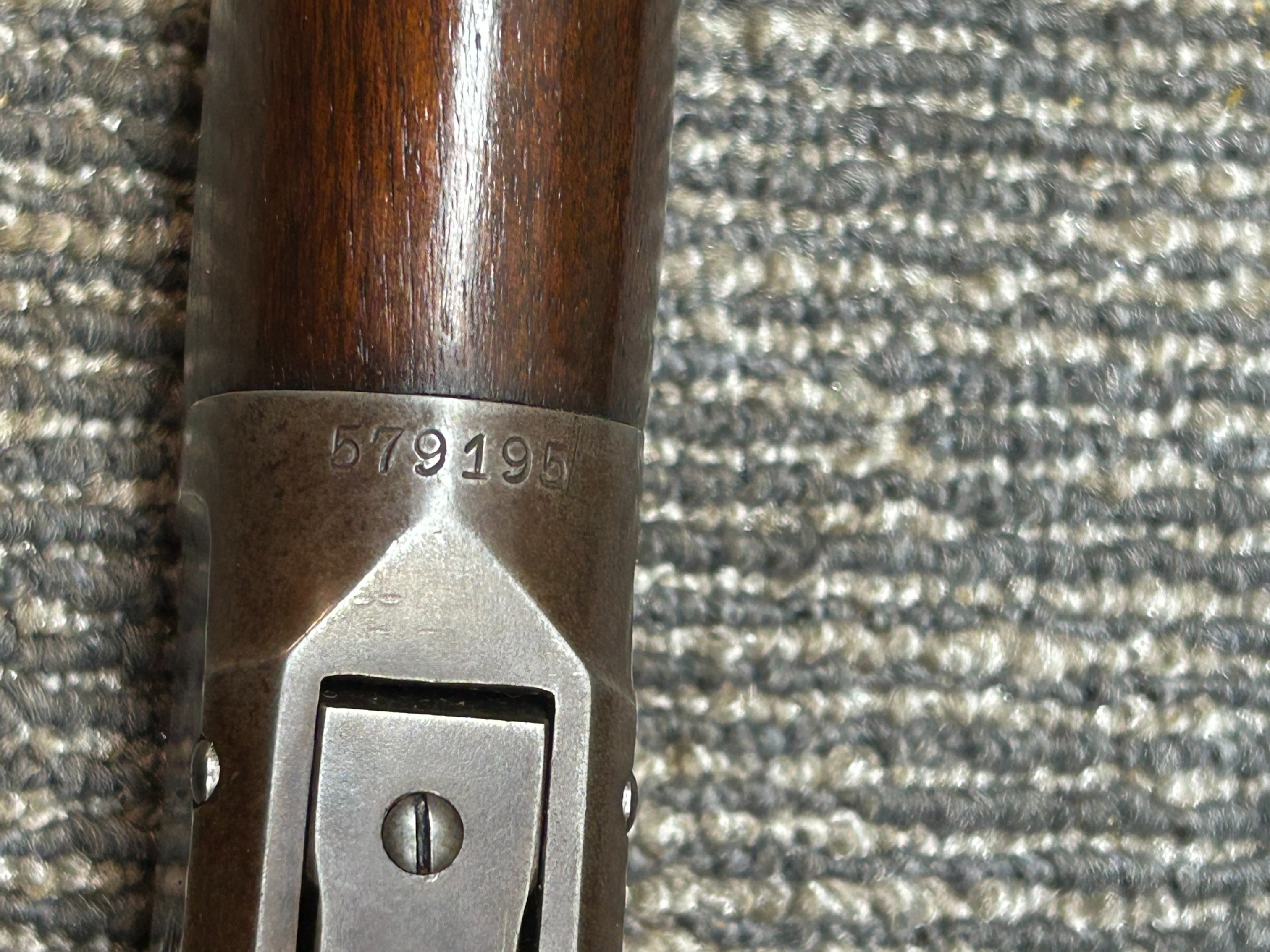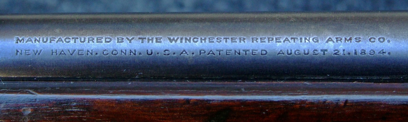 Your Model 1894 is a standard “Sporting Rifle” with a 26-inch round barrel. The Winchester marking should be on the left-hand side of the barrel just forward of the rear sight (as shown in the picture I have attached). If you cannot clearly see the roll marking, the barrel has most likely been subjected to a buffing device.