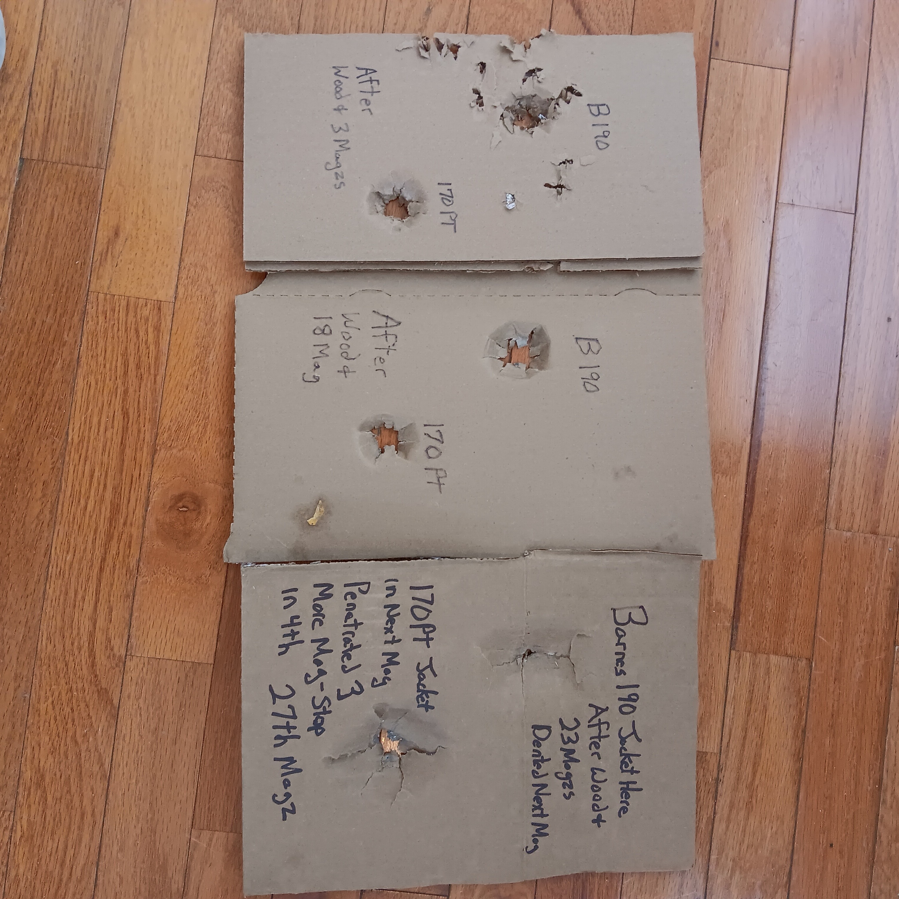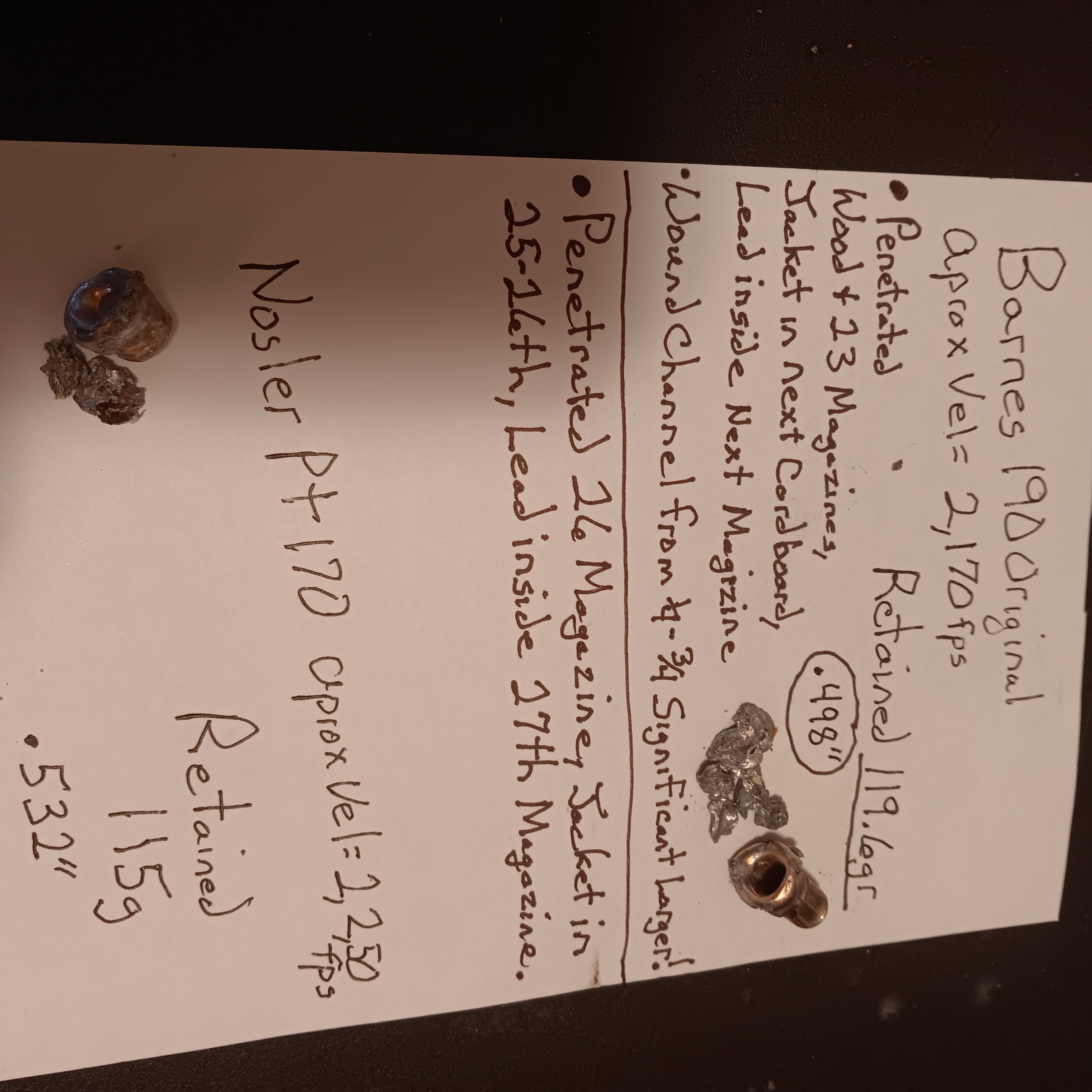 OfflineMe being just a WT Hunter this really a to tough test, but it still shows a lot! This pic really tells the results along with the final. The Nosler 170gr Partition did penetrate further, but the wound channel of the Barnes 190gr was immediate, and did much more damage thru the mid way part. The Nosler did as its famous for, slow and steady mushroom! But look at the lead fragments damage after the first wood, which was 7/8 thick plywood & 3 magazines! And the channel the entire first 2/3 was much more!
