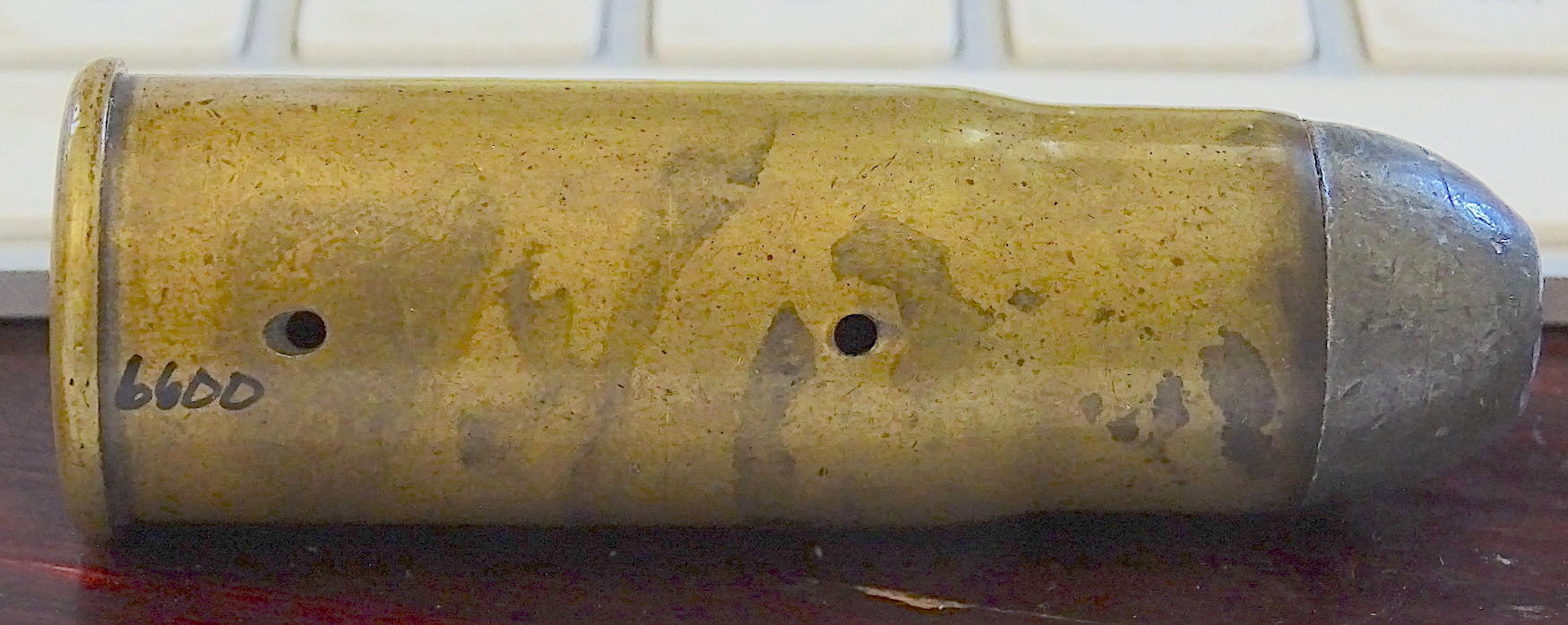 2-The second, being made from a plain WRACo shell,(thin rim), with no Head Stamp. The smaller, “X”, copper tube insert is evident on the tip of the bullet.