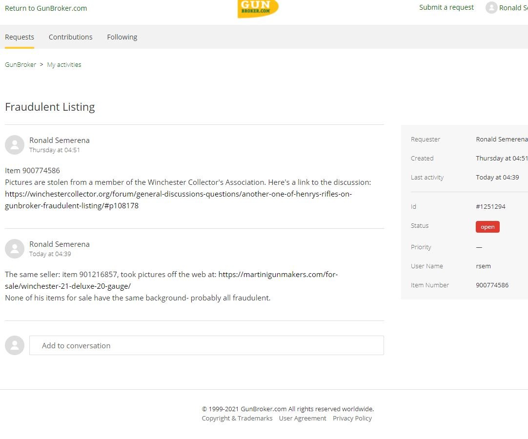 OfflineThe yellow box doesn’t link to the correct report location. To report a fraud, you fill out a form : Submit a request – GunBroker