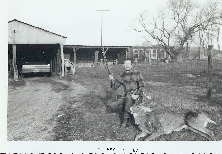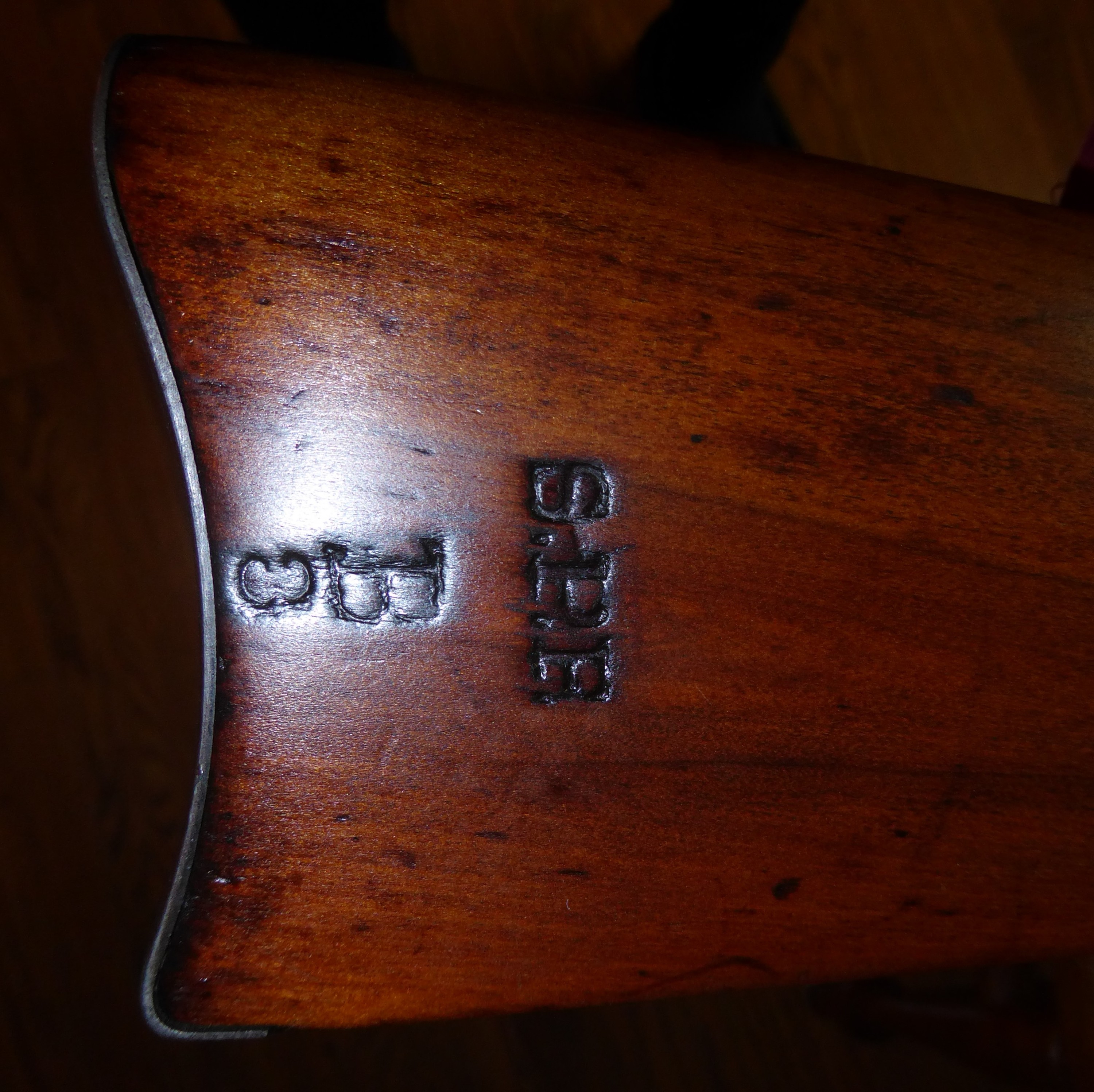 A friend of mine purchased this Model 94 carbine in 1966, and has always wondered what the buttstock markings are. I told him I would post it here in case someone recognized them. The carbine is sn:882355, serial number applied March 05, 1919. He bought it at Bravermann Arms, Wilkinsburg, PA in 1966. It also has a strange front sight hood that I’ve never seen before. Here are pictures of the carbine along with a picture of him with a buck he took with it in 1967.