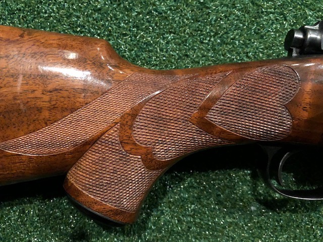 Yes. That is interesting. As I recall, Roger’s rifle (shown in the book) was a very late serial number made up by the custom shop either in ’63 or sometime thereafter and engraved by Nick Kusmit. It did have two different l.p.i. checkering in different panels, as does your stock.