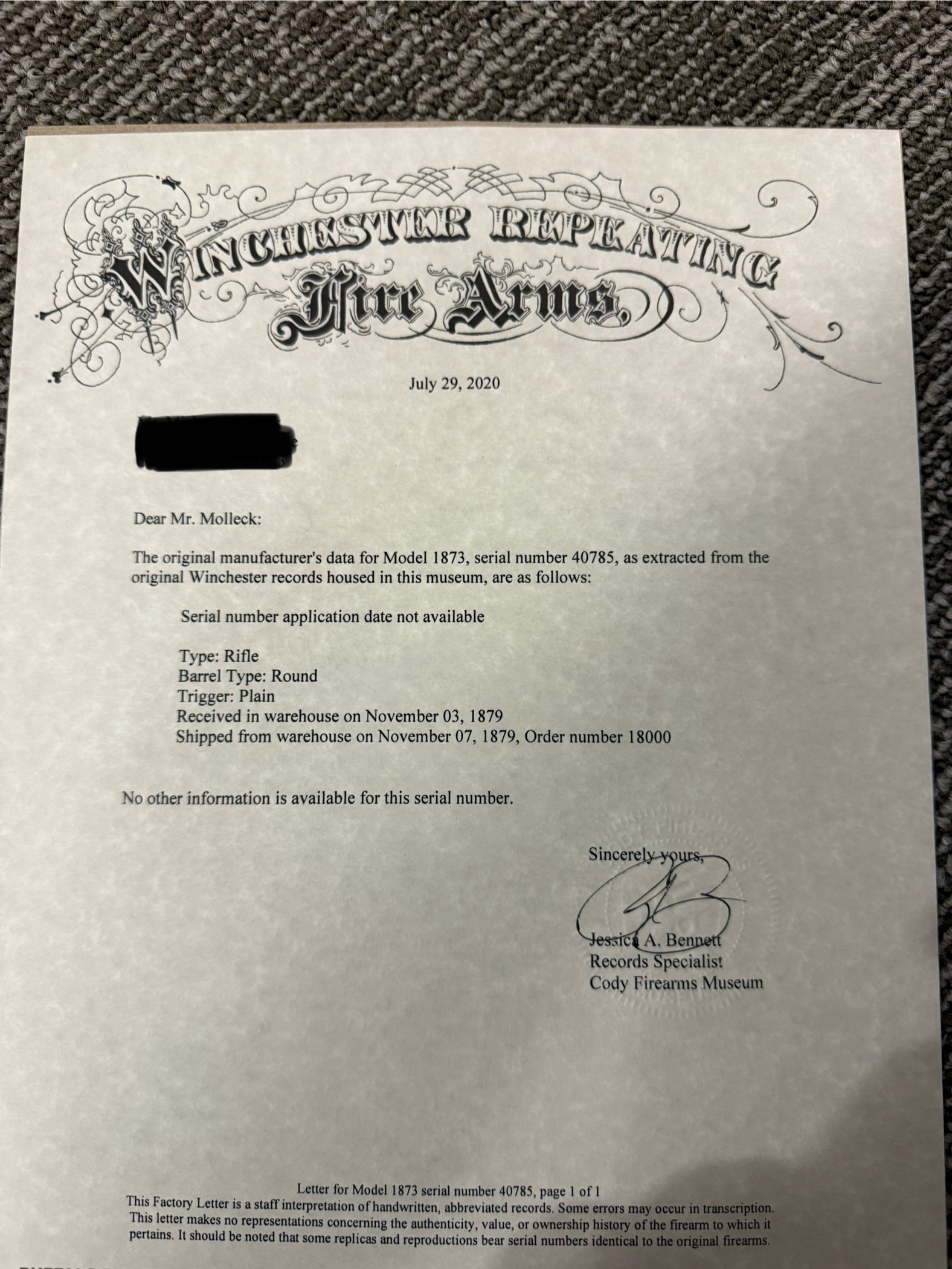 Thank you for the welcome. Its serial number is 40785. The letter doesn’t specify the caliber, and I haven’t found any markings on it saying the caliber. So I’m assuming a 44-40. I will post a picture of the sheet in this main thread