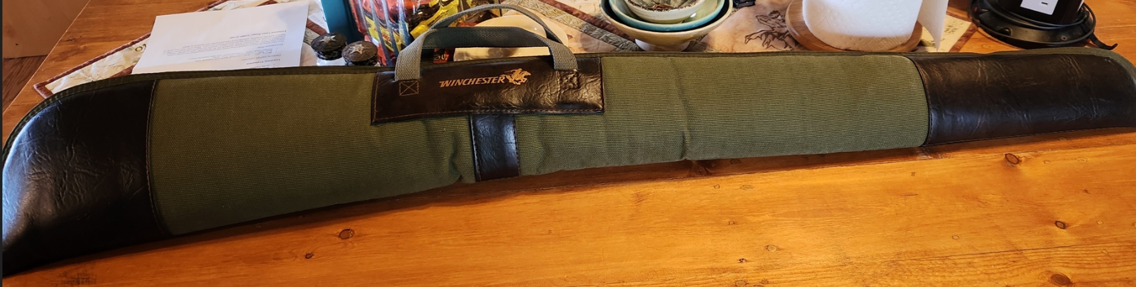 I recently acquired a vintage Winchester rifle case and I’m hoping someone here might recognize the model or have insight into its production era. It’s a soft case made of green padded canvas with Brown leather accents at both ends and a Brown handle. There’s a stitched leather patch near the handle with the “WINCHESTER” name and a decorative emblem.