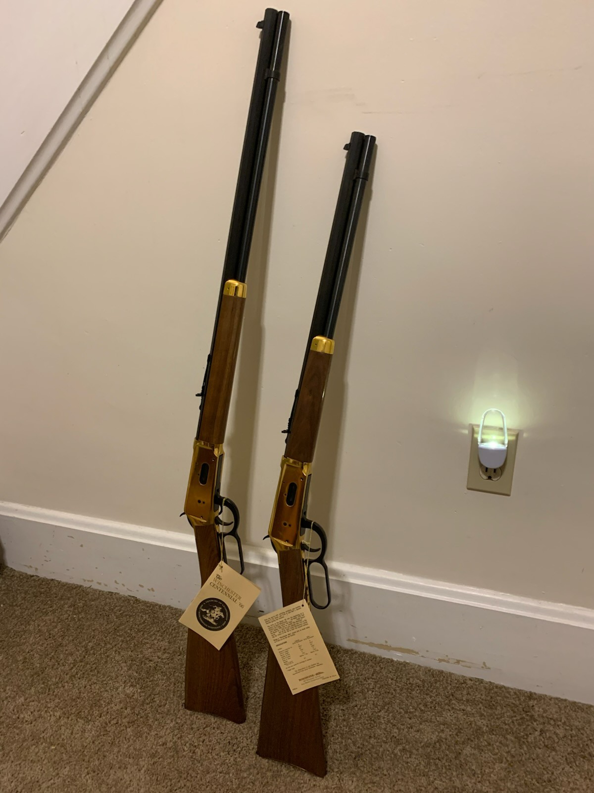 OfflineAs you’re aware of, the Centennial model 1866-1966 commemorative rifle, and carbine that were offered in 1966, were some of the very first Commemoration’s that Winchester offered. A total of 102,309 we’re mfg.(out of a possible 102,666 as indicated), in both configurations. I don’t see where factory sets we’re ever put together as yours we’re probably put together at the time of purchase as these we’re not serial numbered at all.No prefix, or suffix either, unlike many later commemorative, rifles and carbines.