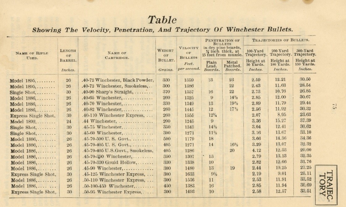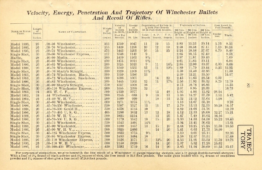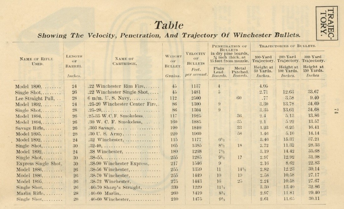 OfflineThe tables showing Velocity, Penetrations and Trajectory were published in all of Winchesters’ catalogs for at least a 20-year period (mid 1890s through 1916).