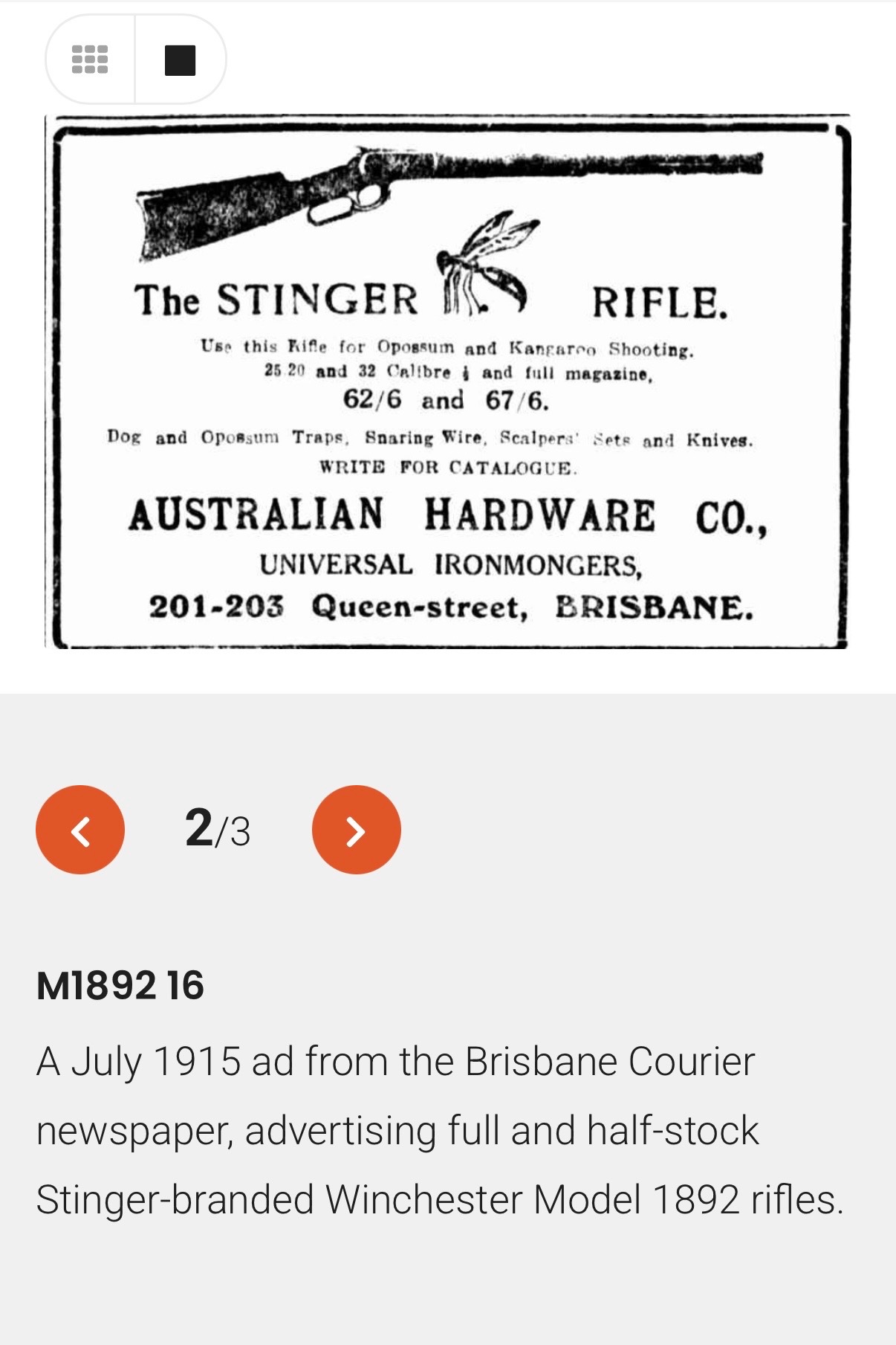 Between the 1890s and ~1920, Winchester shipped Model 1892 carbines to Perry Brothers Ltd. of Brisbane, factory-marked as “THE STINGER” with a wasp emblem.