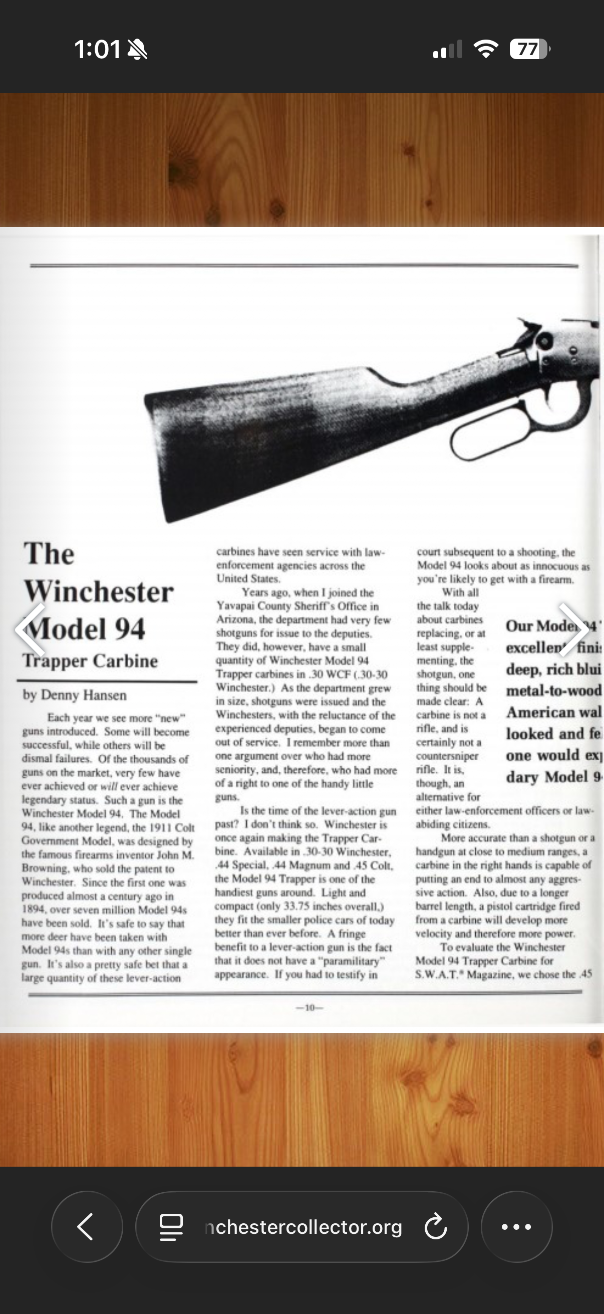 OfflineWell , to the best of My knowledge the term “trapper” , or “baby” was invented by some one in the gun community. If You got a factory letter for one , it would say, “carbine, barrel length 15”, not “trapper” and “half magazine”, not “baby”. But again in all practicallity the term “trapper” is easier to speak and does present a certain picture. If I were to be stuck in the wilderness with the choice of 1 firearm, it would be a 14″ or 15″ short s.r.c.. I am not a hunter, but if You ever carried one of these short guns, You would understand why so desireable , not only by trappers, but seal hunters , south American mounted police etc. These little guns were so light and versatile, especially being a repeater and a s.r.c. . Being a repeater one had multiple shots at an animal, or. , and being a s.r.c. one could hang it on a belt or sash, like a pistol and could be accessed and used with “one hand”, plus had the reasonable range of a short rifle for 2 handed use. Much the same can be said for the mounted horseman. I don’t know how many Winchesters seal hunters carried, I do know of 2 , both 1892’s in 32 cal.,that I seen, but a short, usually sawed off smaller caliber gun was used, and any I’ve seen were “very well” used and beat to snot, I call them canoe paddles. They are the perfect firearm for carting around through the bush and swing around so quickly to get that quick shot off. I just never understood why they never got more popular than they did, back in the day, however that’s a good thing for We collectors Who love these little guns, and finding an example in fine original condition is quite an undertaking.