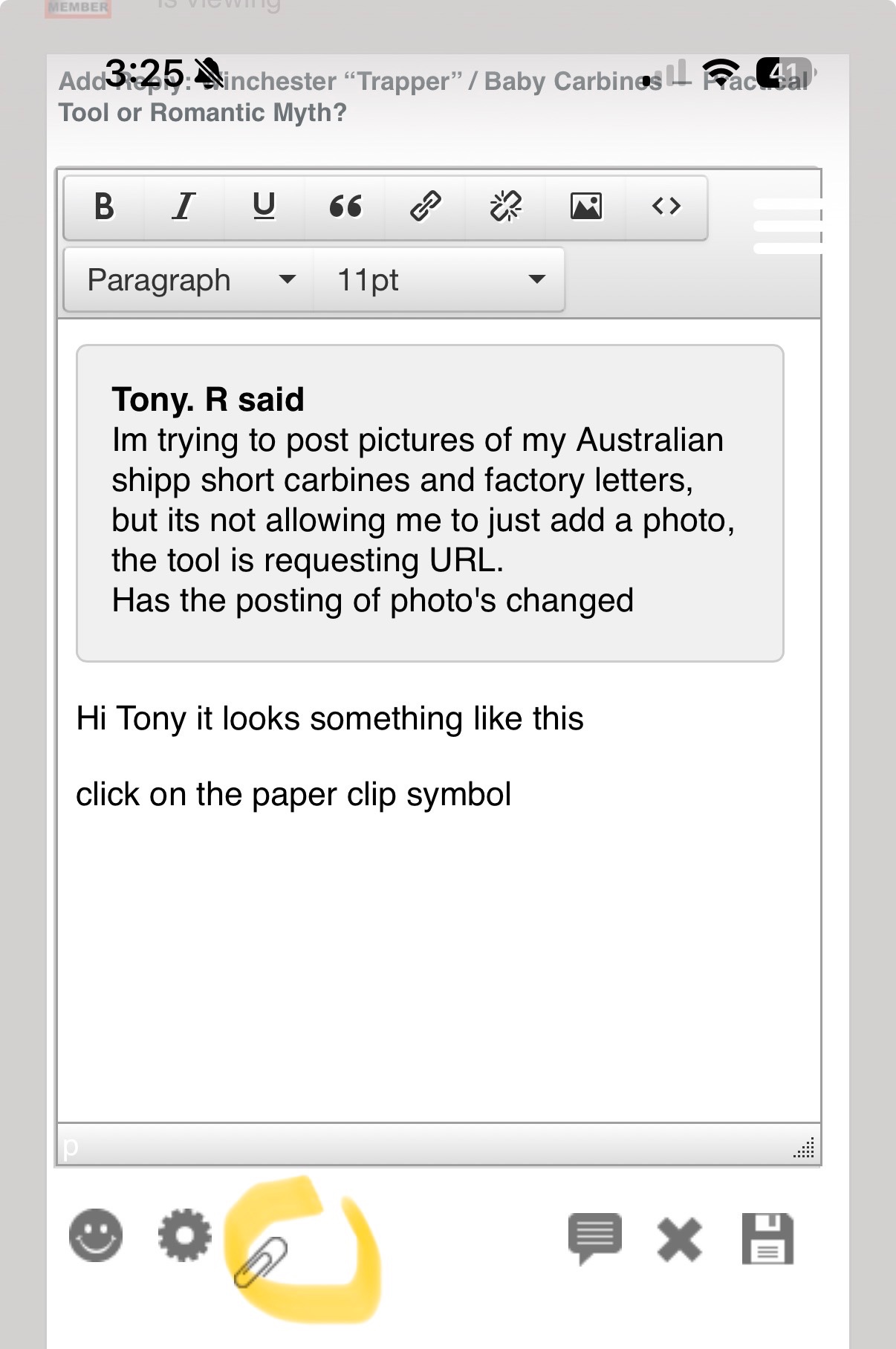 Im trying to post pictures of my Australian shipp short carbines and factory letters, but its not allowing me to just add a photo, the tool is requesting URL.