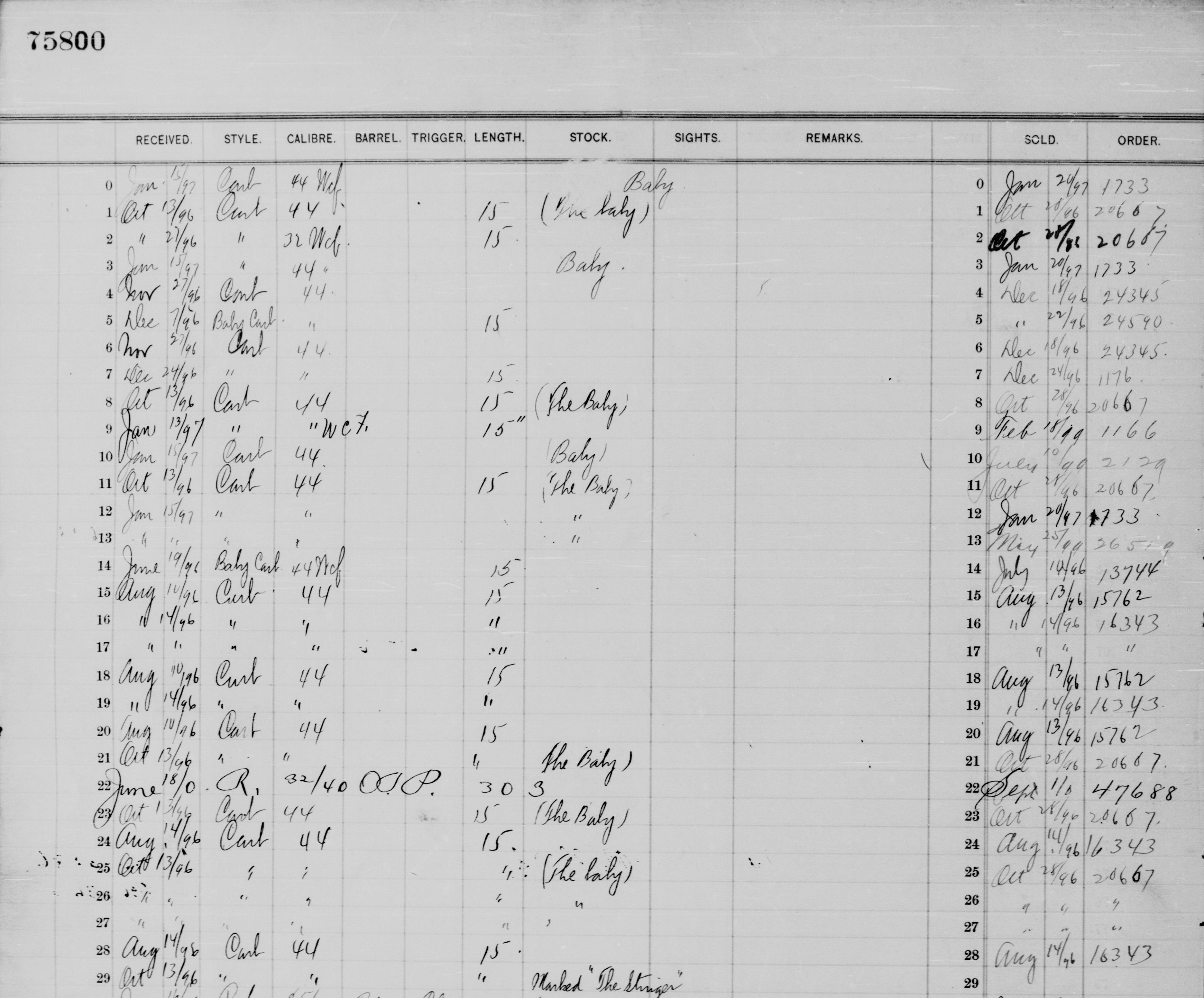 The picture below is a scanned copy of the warehouse ledger page for serial numbers 75800 – 75829, and it shows a substantial number of the 15-inch 44 WCF Carbines. As can be seen, “Baby” or “(The Baby)” is written in the ledger, and that implies (to me) that Winchester physically marked the guns “THE BABY”.