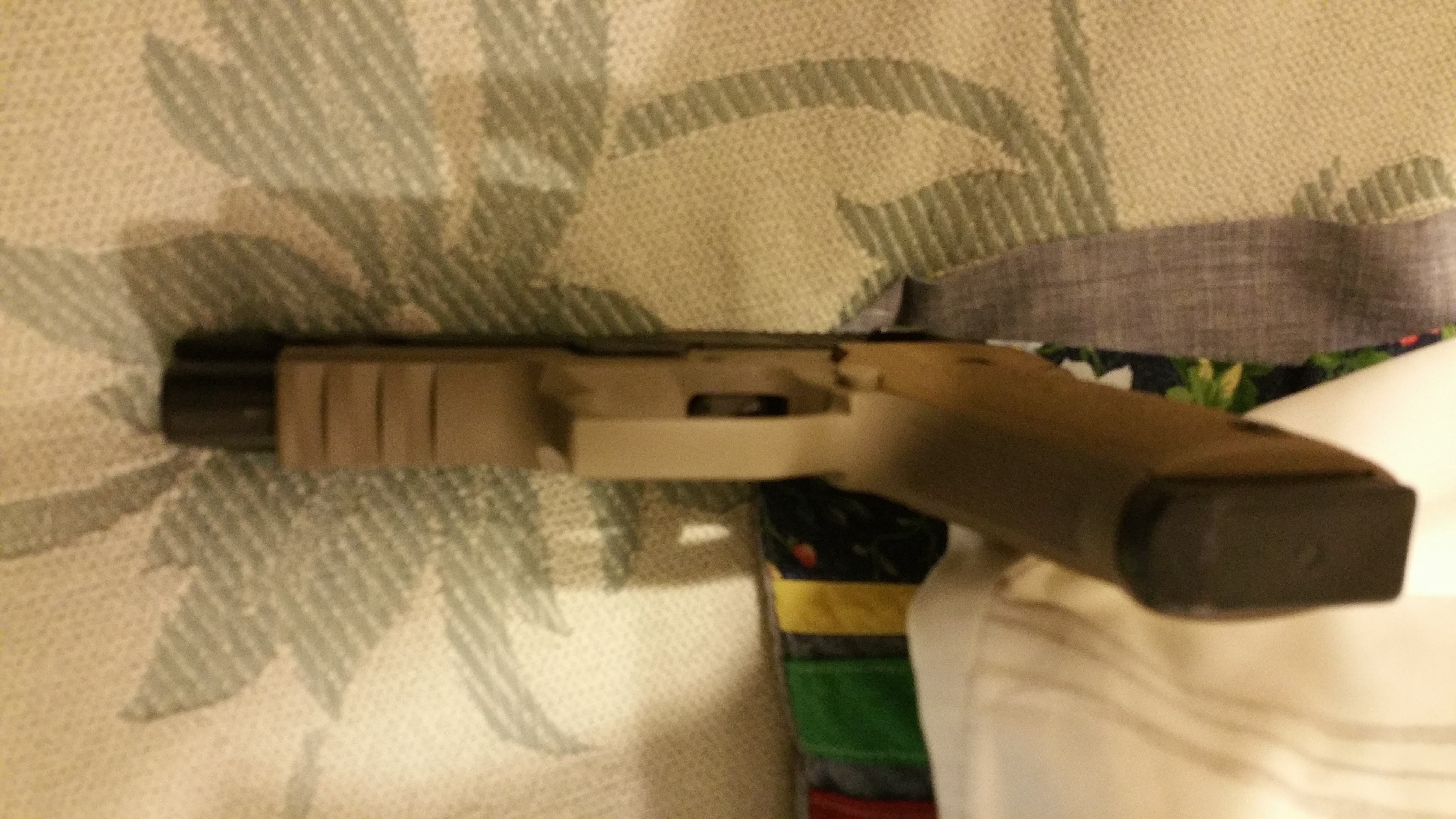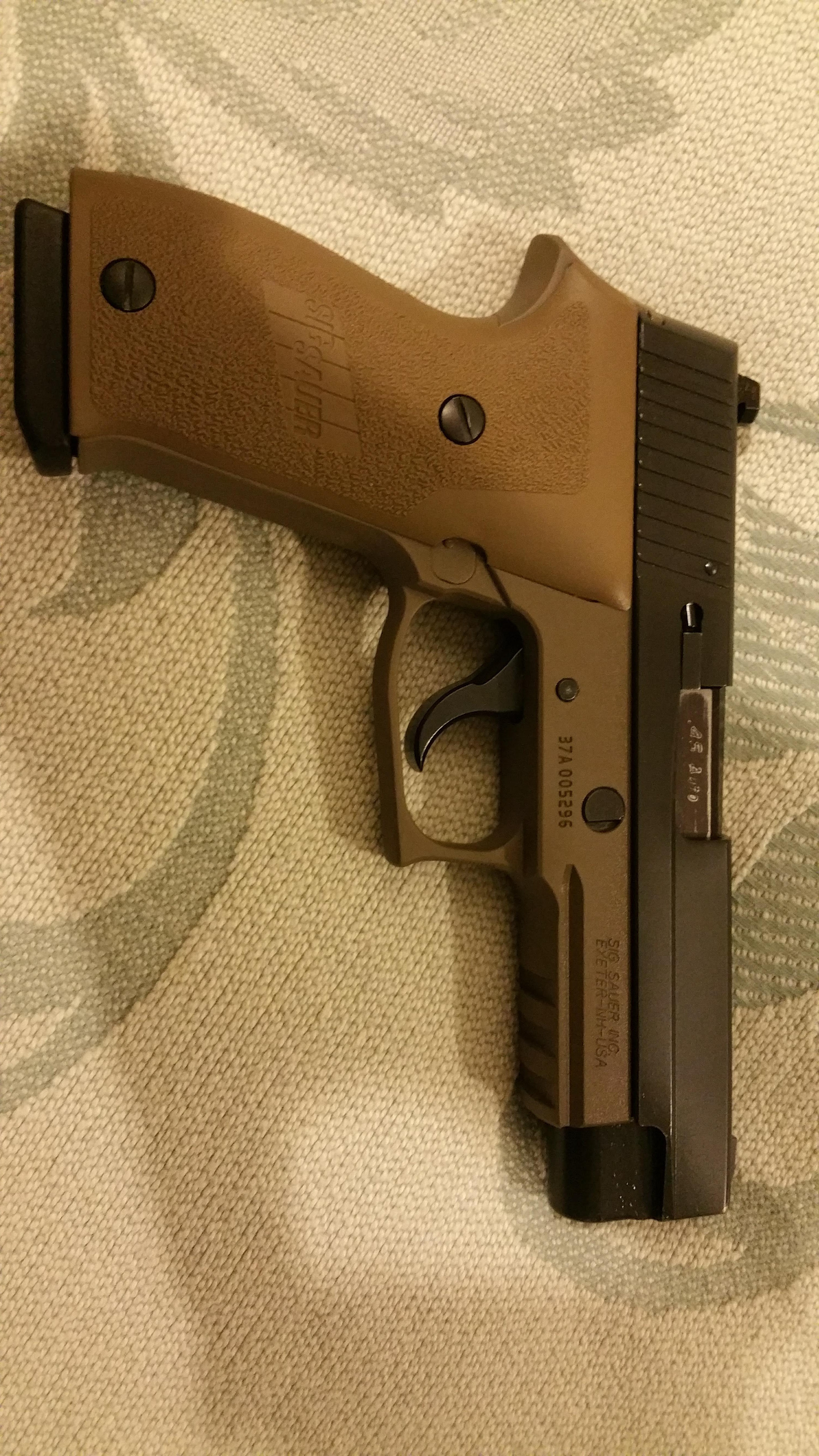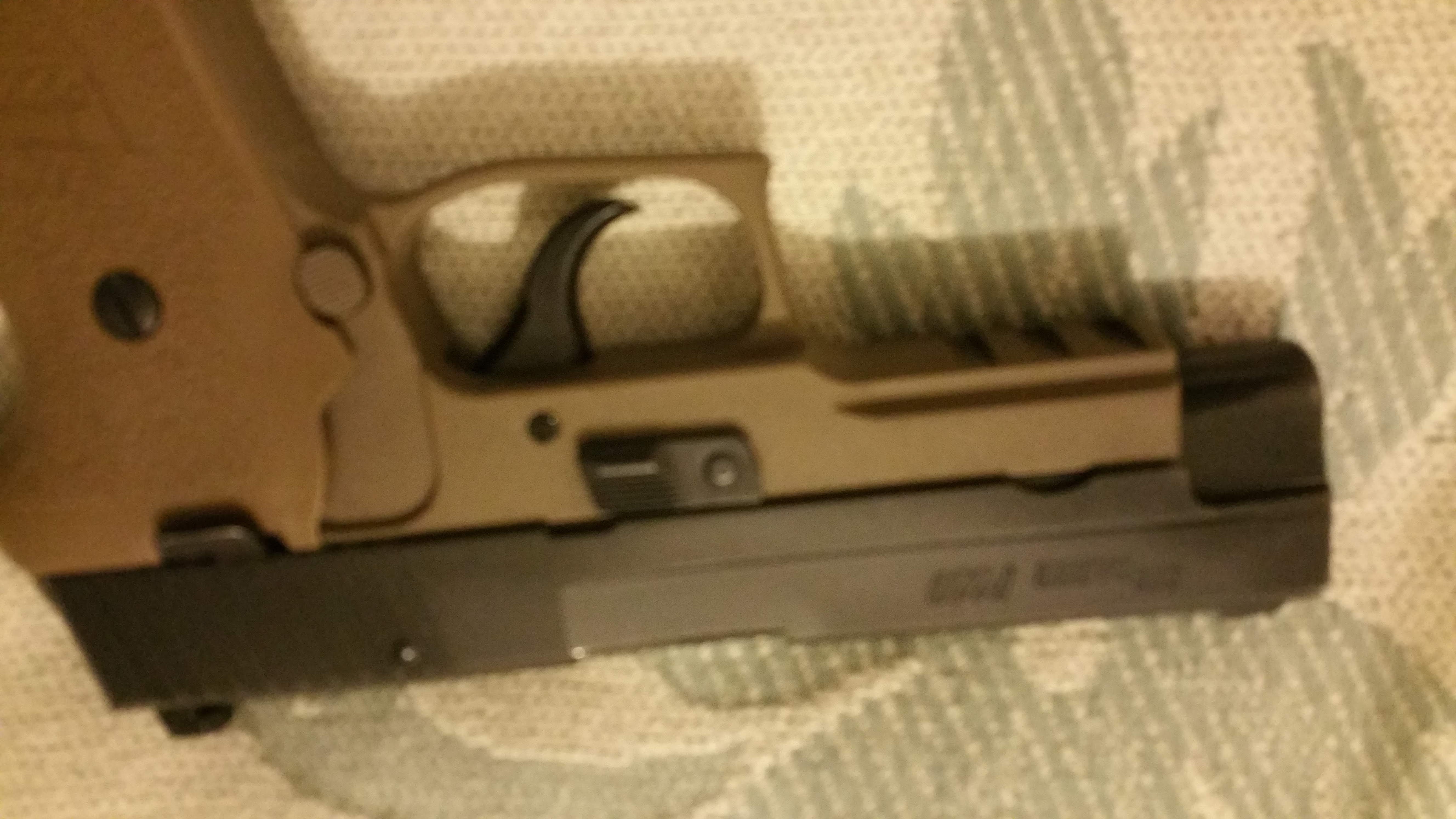 To illustrate Cerakote, I’ve attached pics of a police trade-in Sig Sauer P220 .45 ACP that I picked up because it has the Kellerman Light Double Action trigger i like and Sig once offered. The anodyzing on the frame was a little tired compared to the harder nitride finish of the stainless steel slide. I had the frame stripped and refinished in FDE Cerakote, then ordered FDE grip panels from SIG USA. It serves as a home office gun with a 10-round Chip McCormick magazine of Federal flying ashtrays. A veritable one-handed Linus blanket. ![]()
