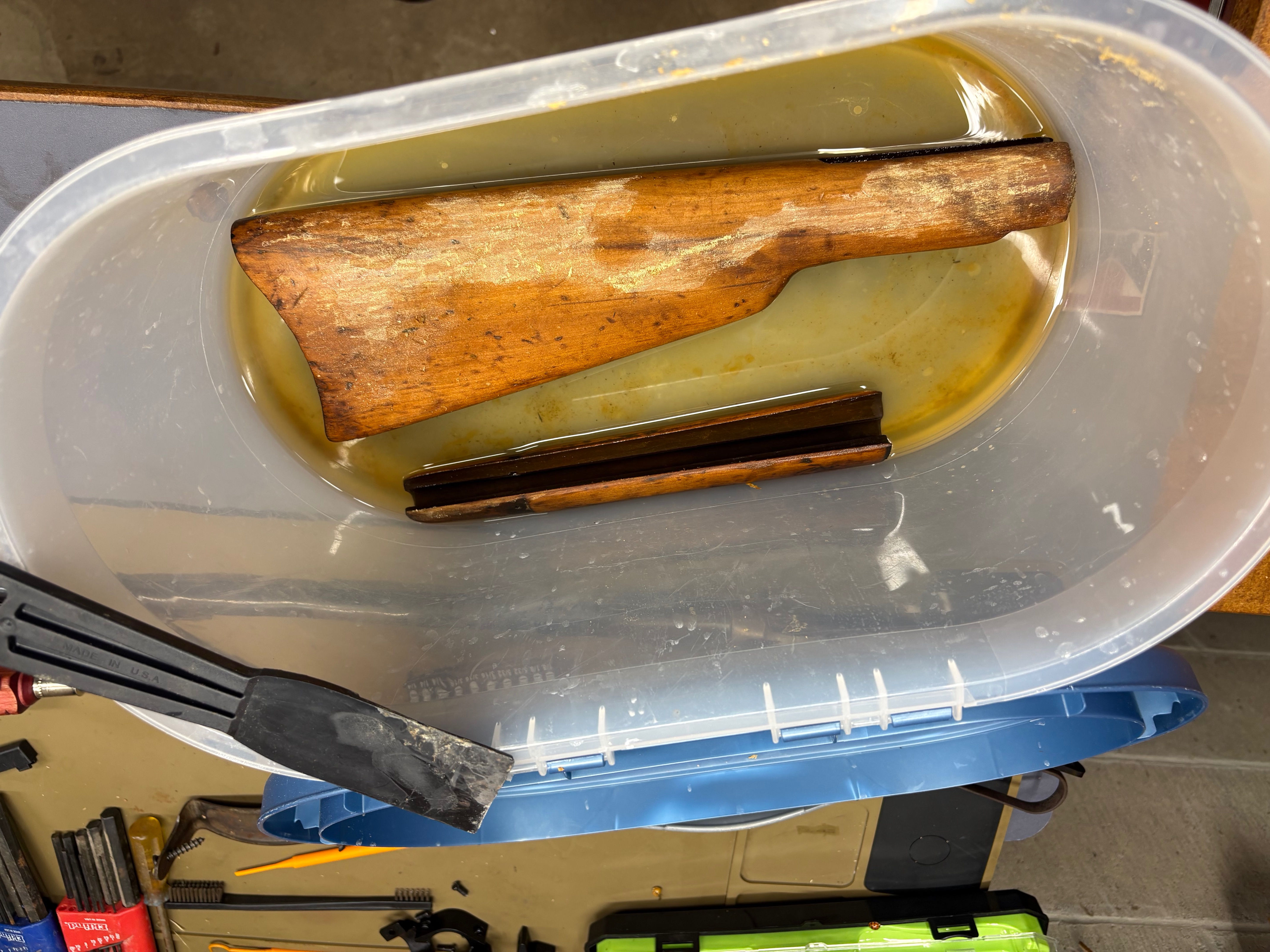 OfflineAnd Bert strikes again…. Acetone loosened it enough I could scratch with my fingernail, so I used what I had and put the stocks in a bath. Letting one side soak for a bit, then scraping it with a plastic knife, then repeat. Didn’t need to soak as long in between after the first 1/2 hour. Once I was satisfied I wiped them down with clean acetone and clean rag.