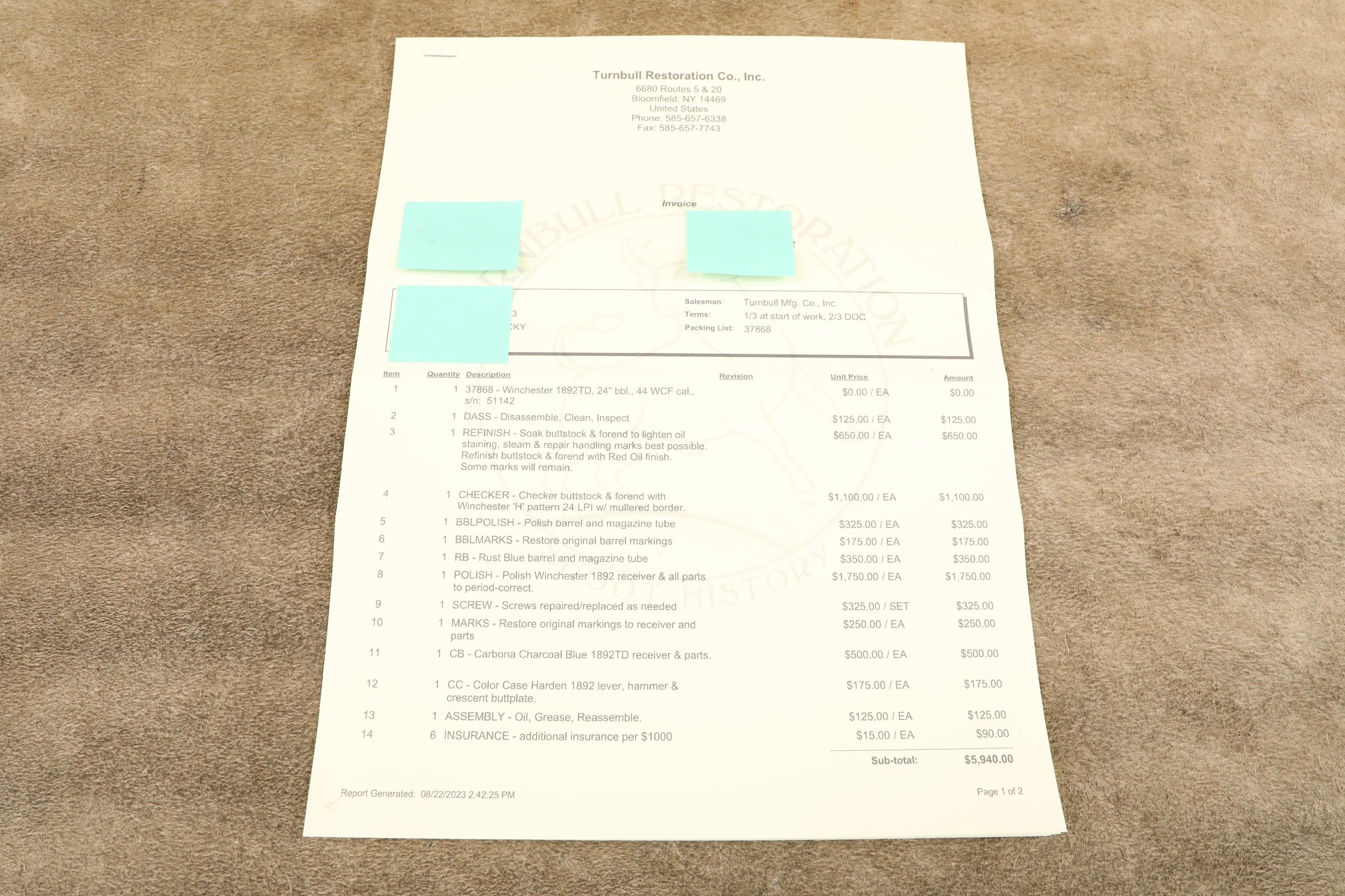 I know that much of the time a Turnbull restoration involves a new barrel and new wood. In the case of this M1892, it is clear from the invoice that the original barrel and wood were retained. That invoice sure gave me some sticker shock. I suppose it would be even more today. All of that to end up with a refinished rifle. Not for me.