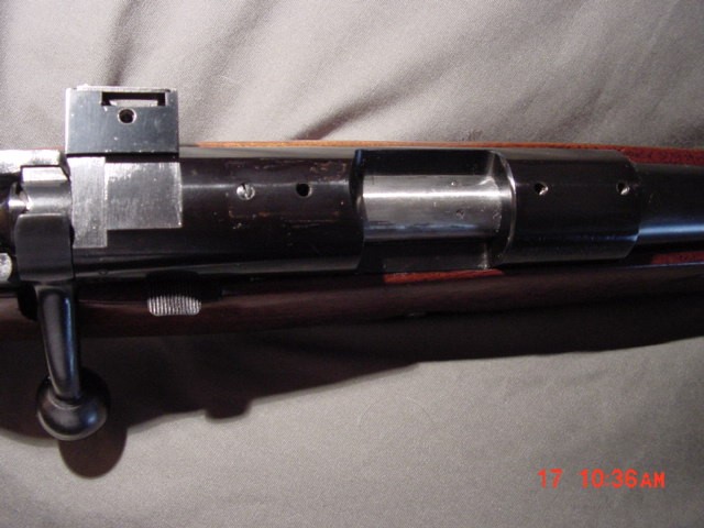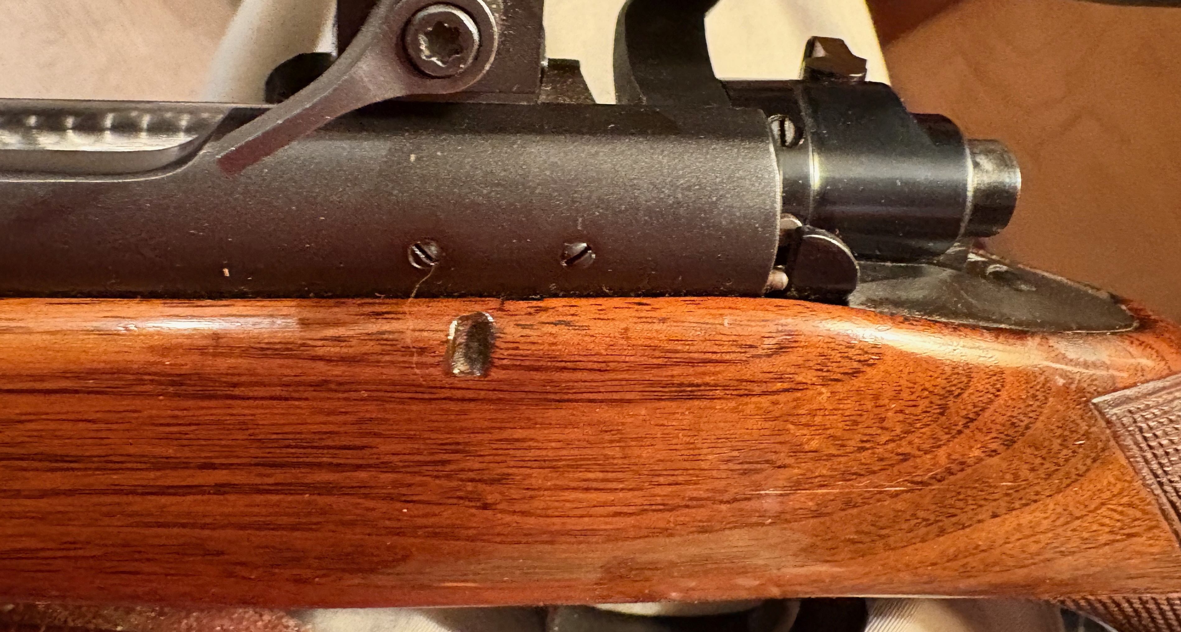 As you can see from the attached photos taken shortly after I bought the rifle, it came with the body of a Redfield 70 receiver sight, shade tree engineered to poorly fit the receiver. The bare stock photo shows (dimly) an indentation made by some sight’s elevation screw, although not likely the Redfield.