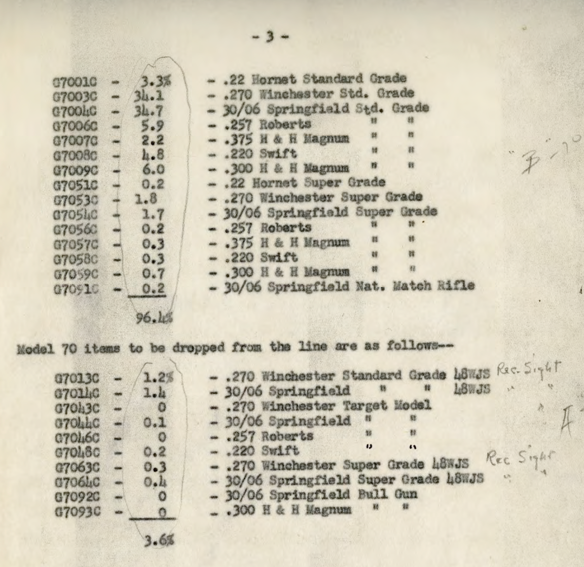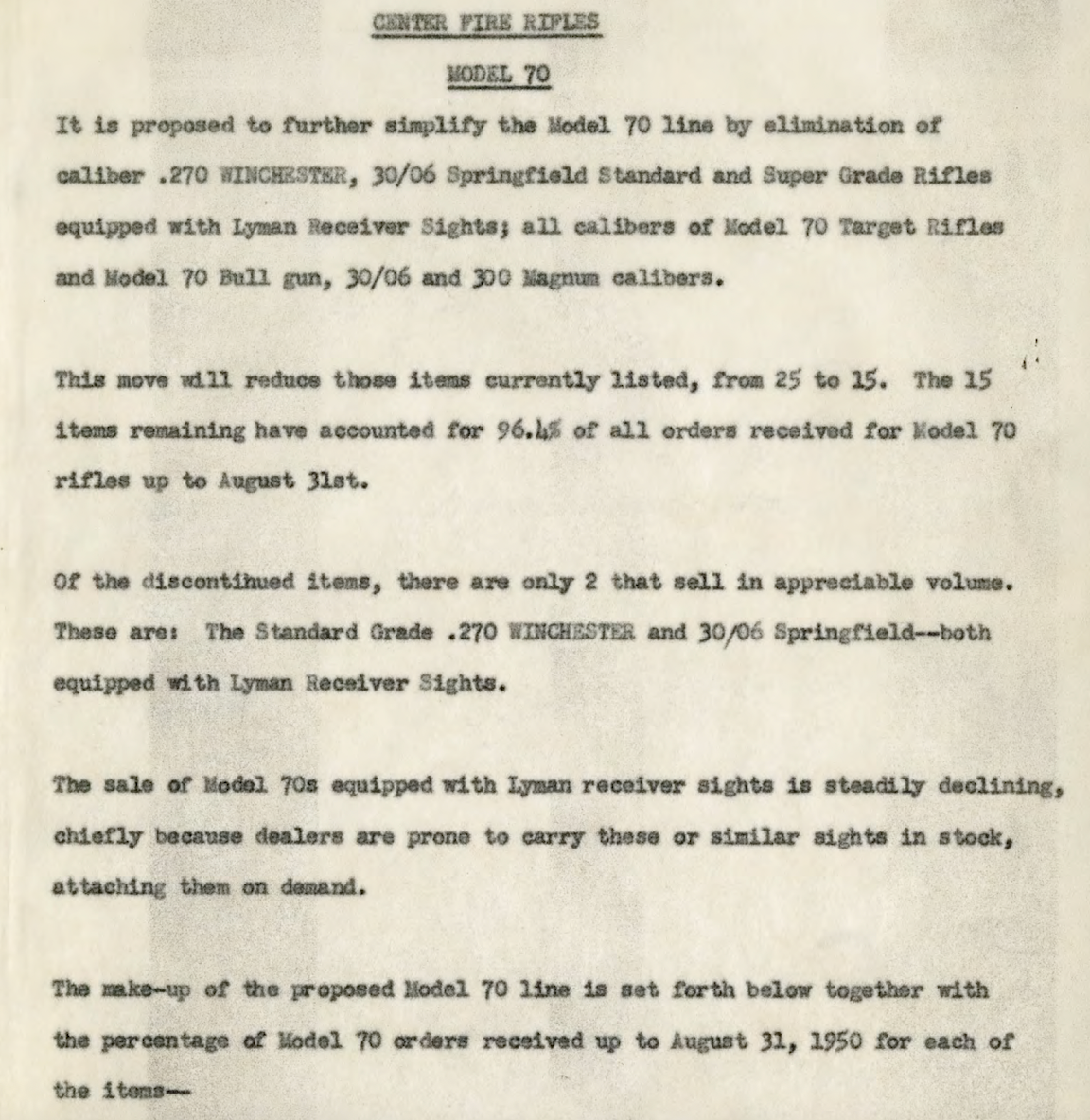 You can see that by 1950, M70 Super Grades with factory 48WJS in 270 WIN and 30-06 SPRG constituted only 0.3% and 0.4% of orders, respectively… People were either going with telescopic sights or installing their own receiver sights aftermarket…