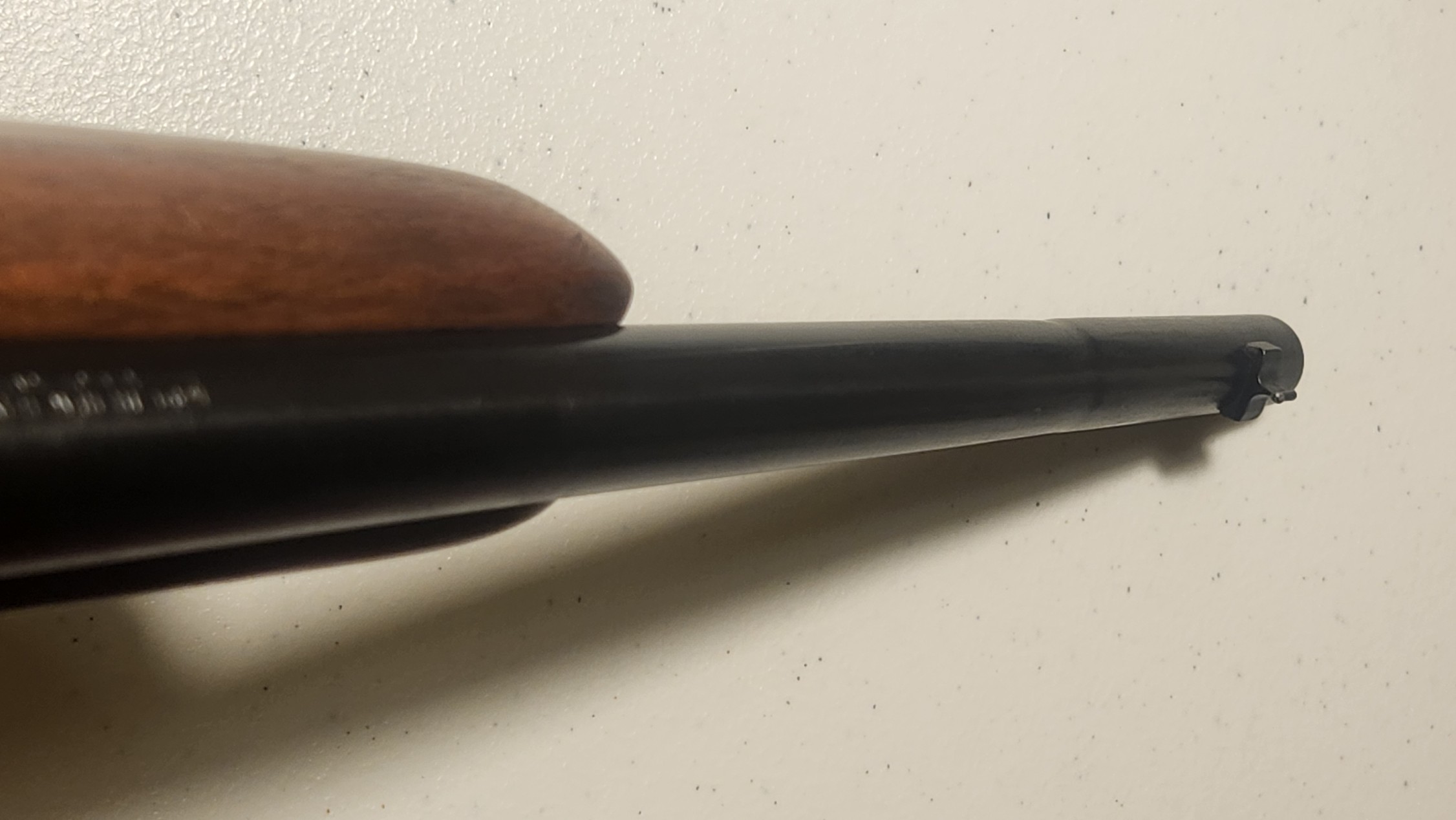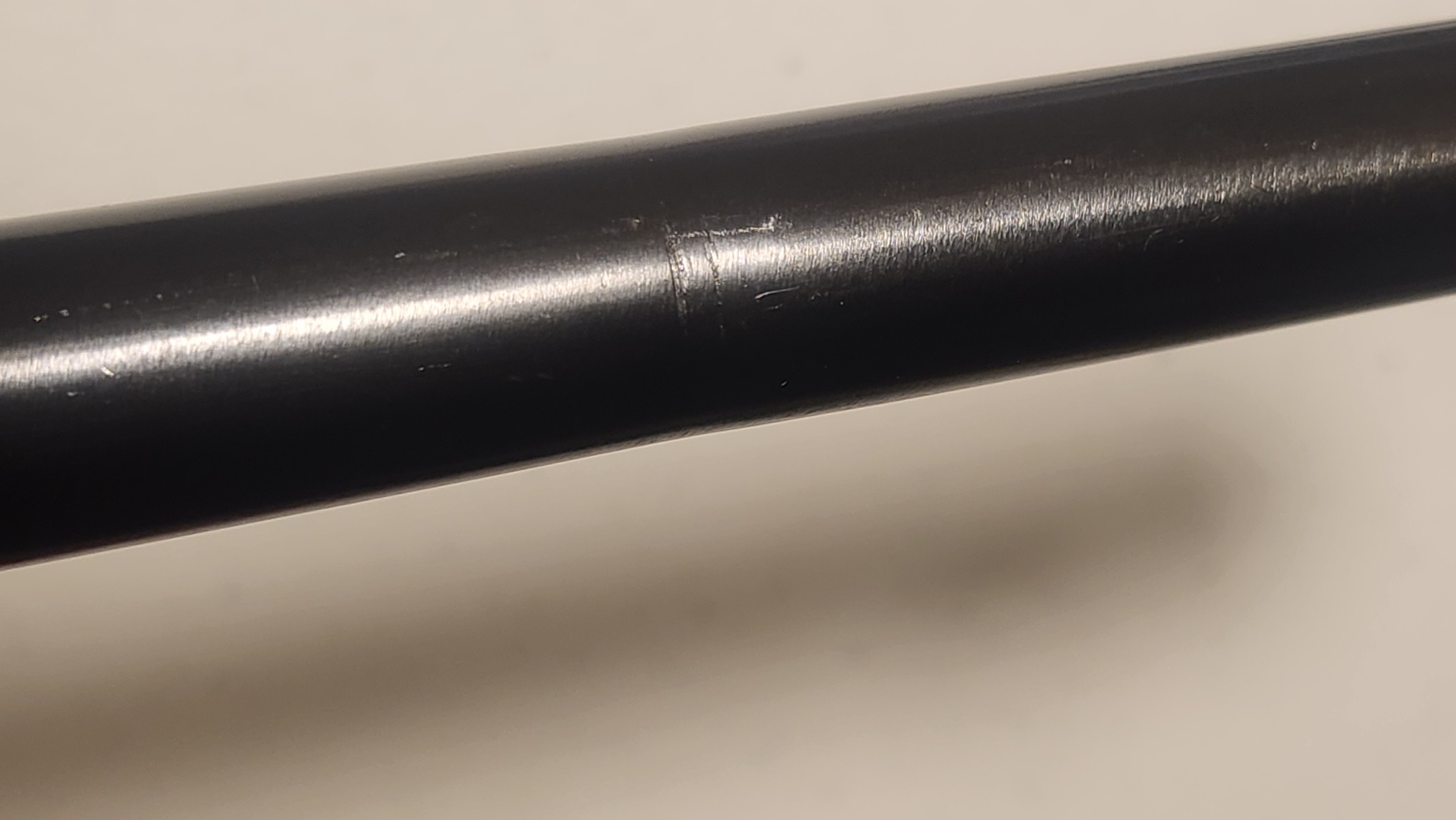OfflineHere you go Anthony…I got it to show up in pics pretty good. In one of the pics at least you can see the depression or hourglass shape contour of the barrel. Also present is two parallel lines that look like a scratch. It does feel slightly indented on opposite side. I don’t think something falling on it could create this but yet, I don’t understand why you would lathe or turn down this section if that is truly what happened…it’s almost like someone clamped something around the barrel there and squeeeeeeezed, but all without affecting the bore. Looks fine inside, shoots fine, can see no oddity in the bore…I guess that more evidence for a lathe turning. May just be a simple answer, someone turned it to get rid of damage or pitting and refinished it, but if they did that, they did a hell of a job and that seems like a lot of effort for one of these. I just can’t let myself believe it left the factory like that either. Mystery!