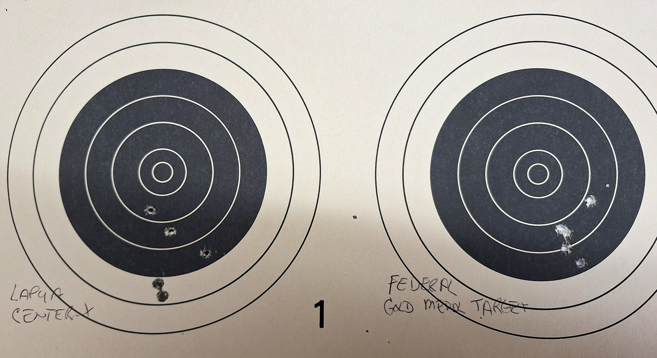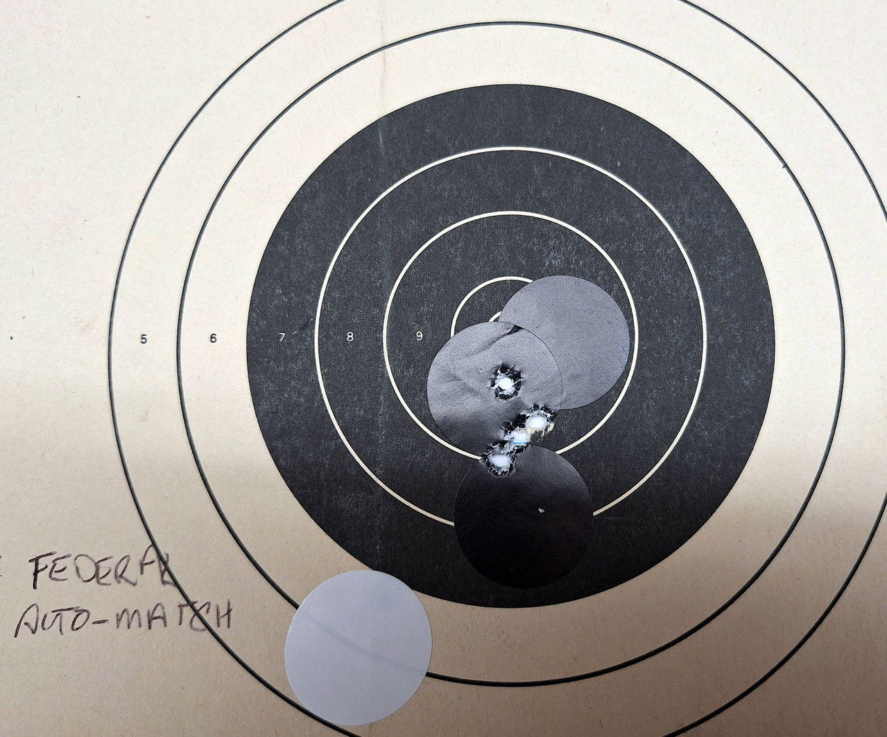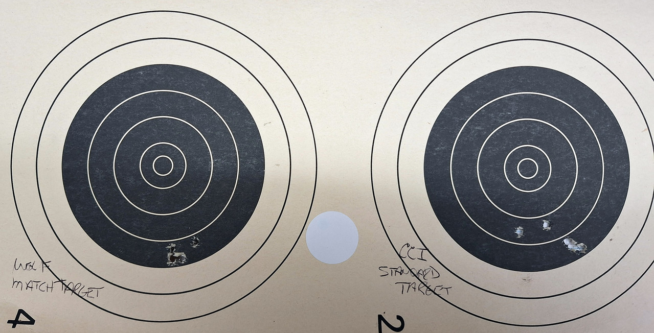 Using a standard NRA 50 yard smallbore target, I fired five groups of five, using different ammo – Lapua Center-X, Federal Gold Medal Target, Wolf Match Target, CCI Standard Target, and Federal Auto Match.