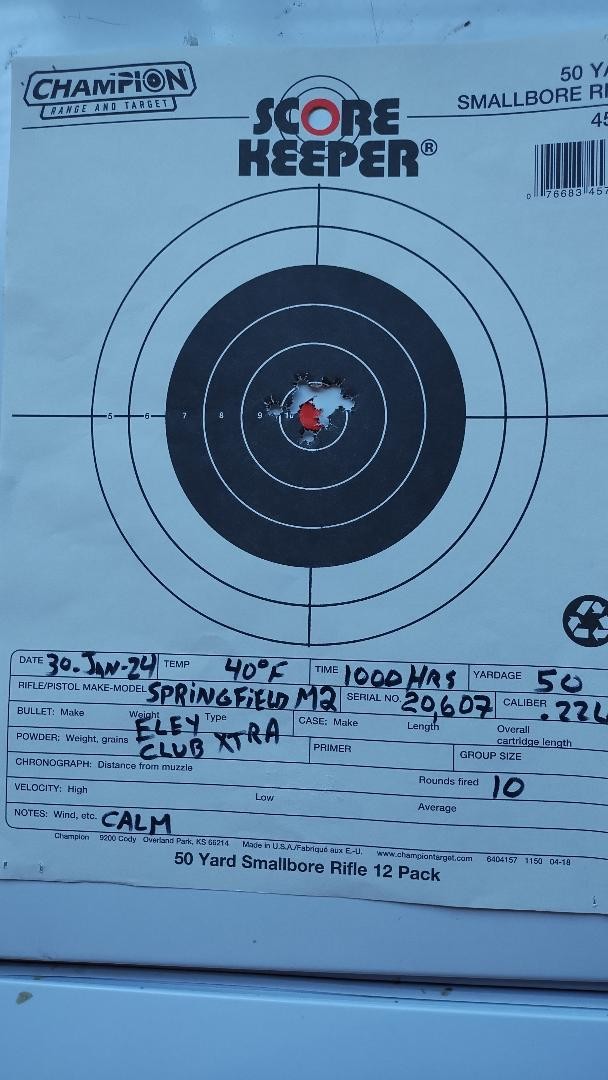 With Red Box Ely, I can poke one small group at 100 yards, benched. My best groups came from my 52-C BULLGUN, but I sold it. BTW, try 100 yards. This target was shot with a M2 Springfield at 50 yards. Big Larry