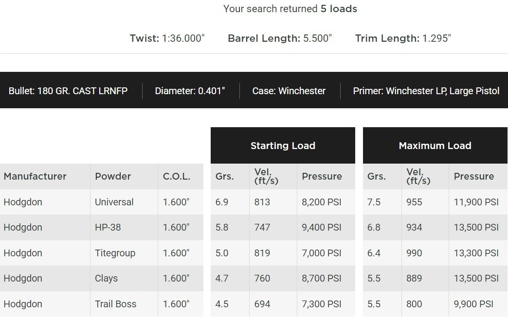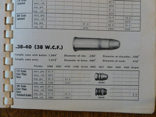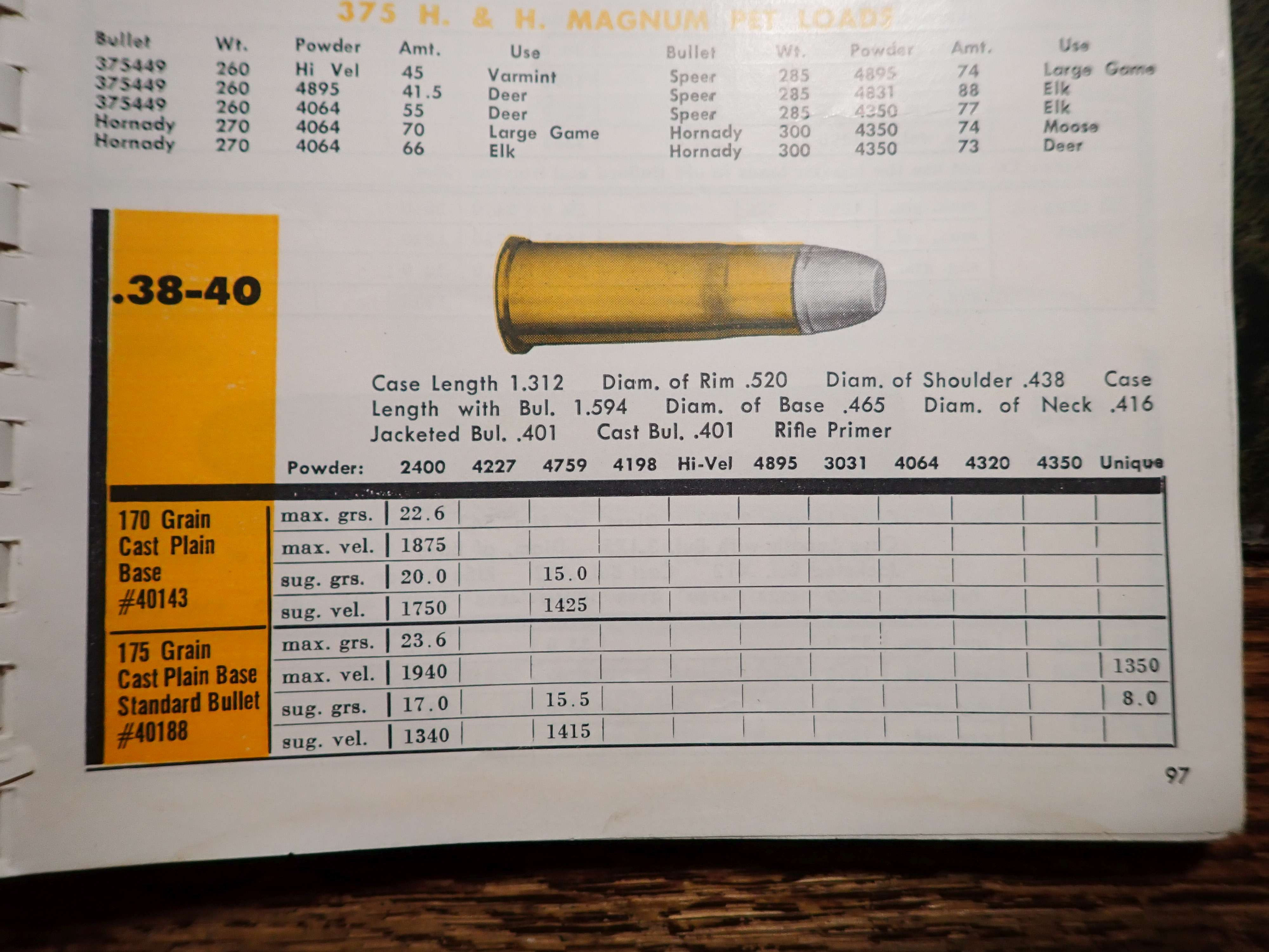 I spent about 45-minutes searching for load data on the Hodgdon website… the only load data they have for the 38-40 are a few very anemic pistol loads.