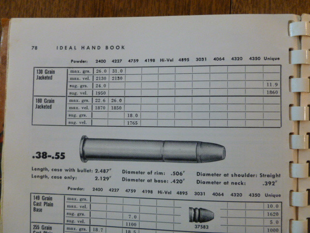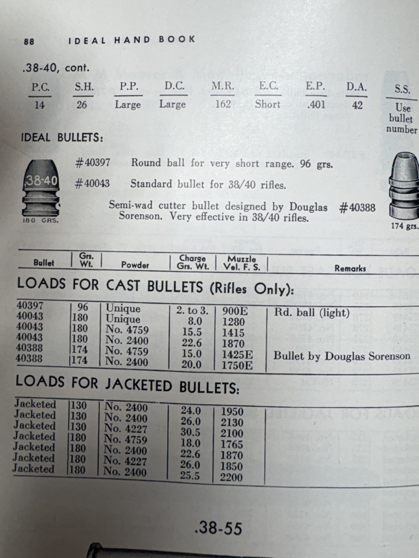 I was quite surprised by the load data in the old Ideal Handbook! I plan to load with A2400, but not quite as stout as the listed 25.5 grain load. I had no idea that the 38-40 cartridge was capable of pushing a 180-gr JSP to 2,200 fps !! That puts it in the same fpe range as the original 30 WCF with a 170-gr bullet load.