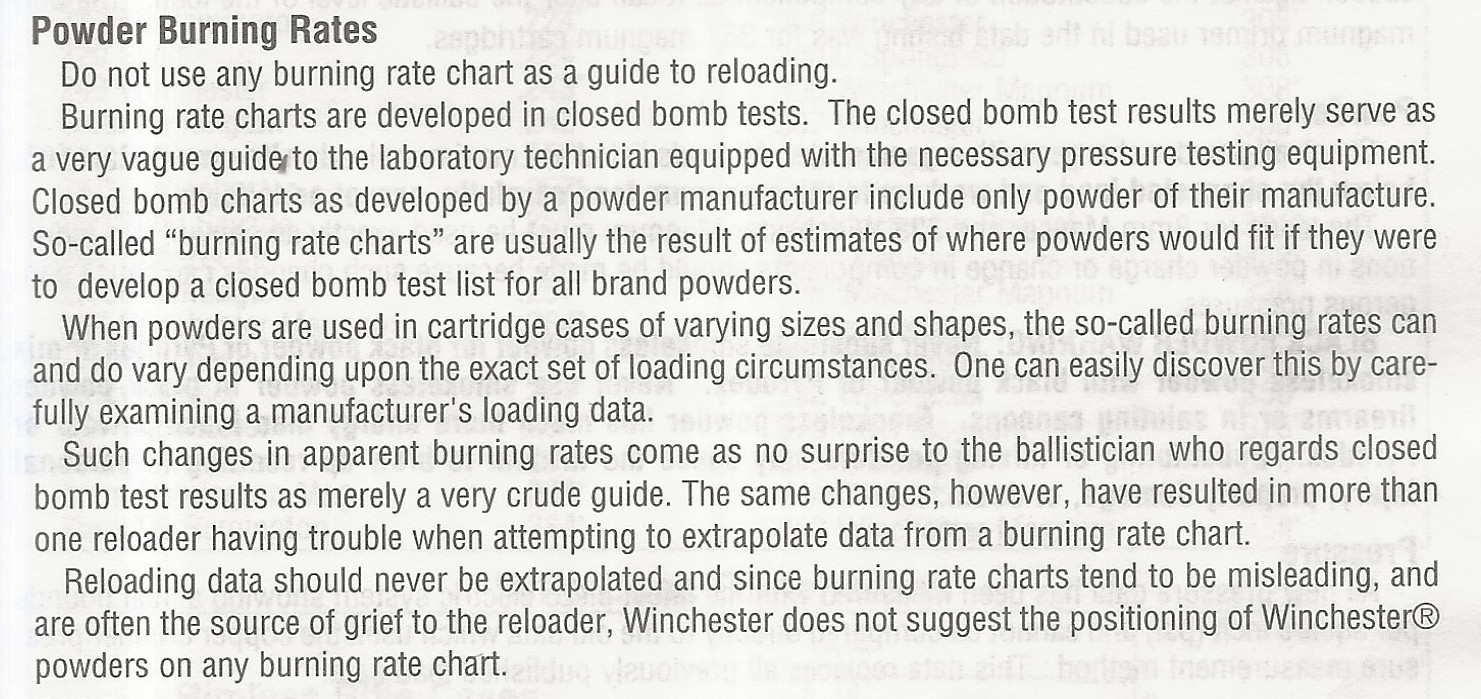 I like burn rate charts but I will always start out with a published load for that powder. All a burn rate chart tells me is if I should try to find a published load for a given powder when it is close in burn rate to another powder that is working well for me. Now that Winchester is under the Hodgdon umbrella I suspect their ranking of Winchester powders has merit. IMR4198 is working well for me, it’s a few bucks cheaper than H4198 around here if I need any more. I have the H198 sitting on the shelf so I’ll use it for something. I saw some 4227 on the shelf at Cabela’s this evening.