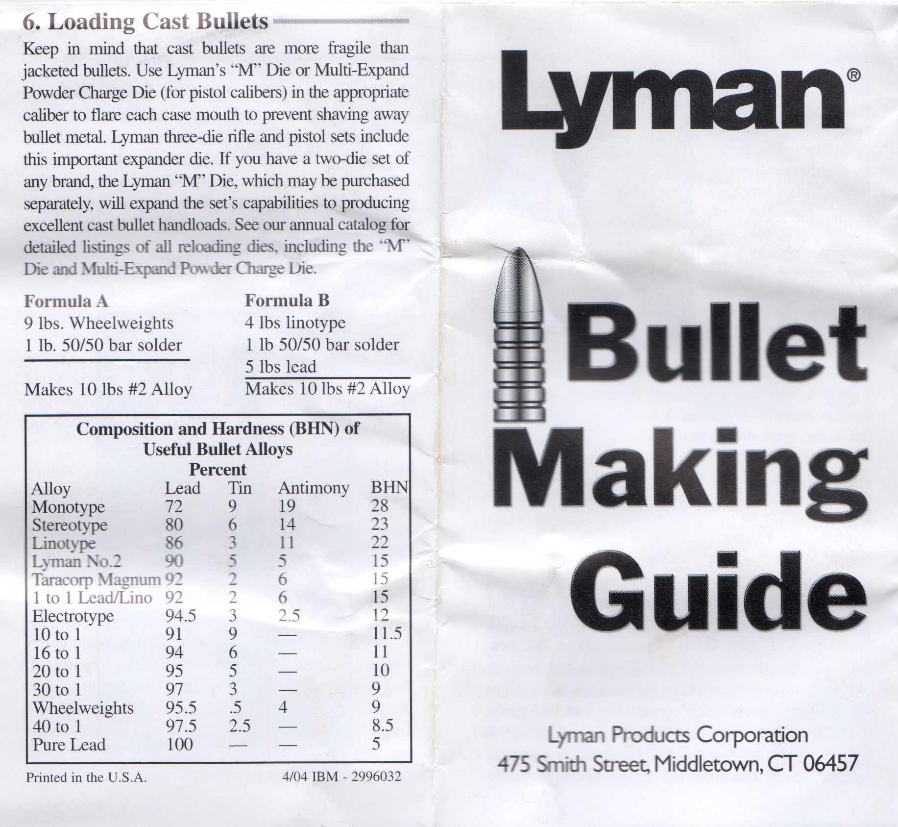 For a guide to bullet alloys, I use the Lyman brochure that came with a Lyman mould I bought years ago. I attached the guide for you to see. It cites wheelweight metal as 95.5% lead, 0.5% tin and 4% antimony.