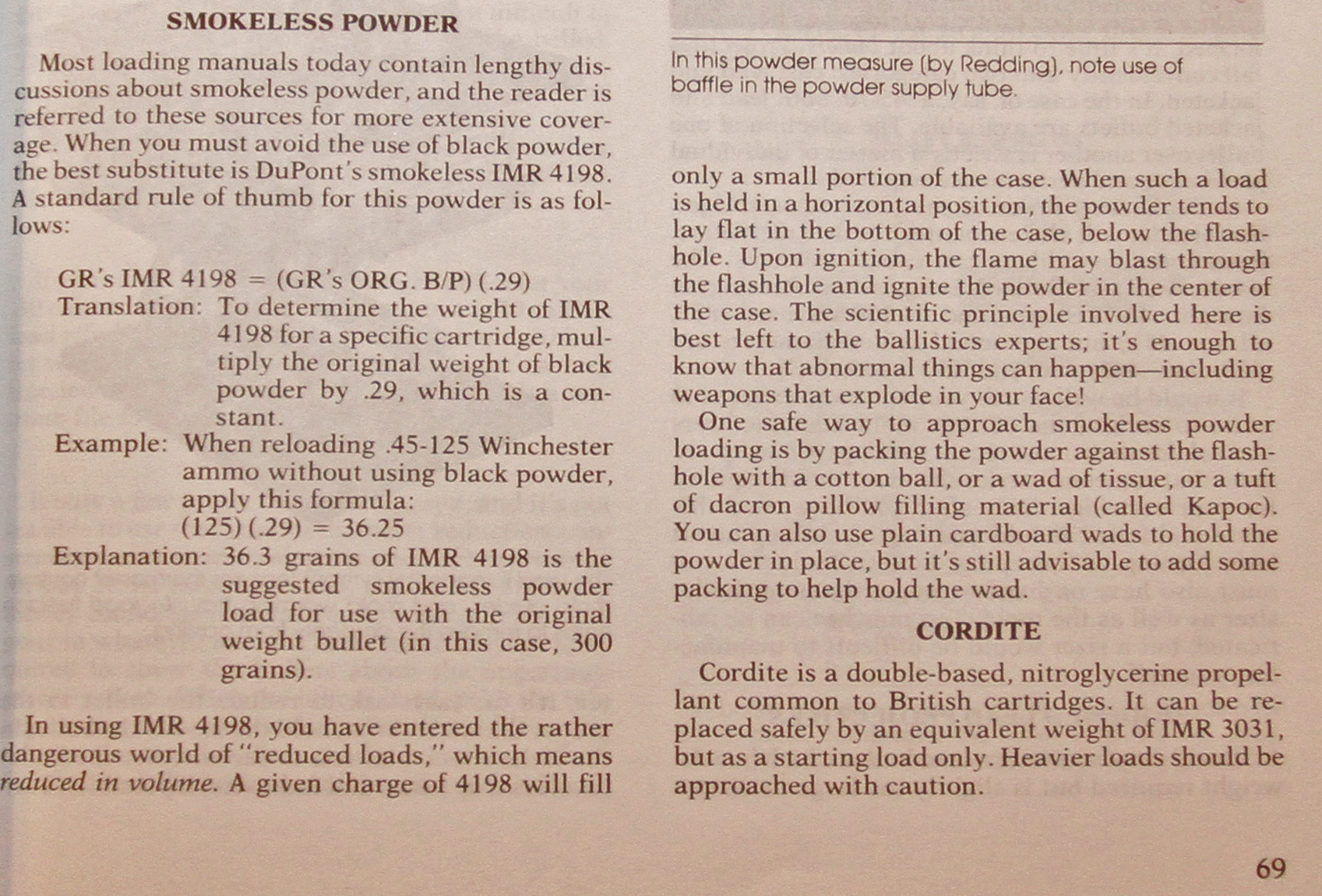 On page 69 of The Handloader’s Manual of Cartridge Conversions by John Donnelly he explains what Bert had mentioned. Donnelly references information from Frank Barnes, Cartridges of the World. So if you buy Barnes book there will be at least 1 smokeless load using IMR 4198 for all of the Winchester cartridges. To my surprise in this example he uses the 45 EX. Barnes book says to use 34 grains.