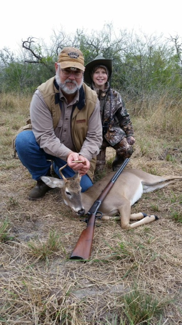 Saturday morning was very busy, I watched somewhere between 15-20 deer in the three senderos I was watching and but wasn’t able to pick out a doe without a fawn (I know, that’s just an old preference) or a cull buck. Had one very nice buck with a broken antler and two other nice young bucks that I felt would be a trophy in a year or two. Lots of does with fawns. A little before I was due to be picked up a nice spike showed up and I made a management decision and removed him from the gene pool. The youngster in the pic with me is my cousin’s son, he got his first buck a few weeks ago.