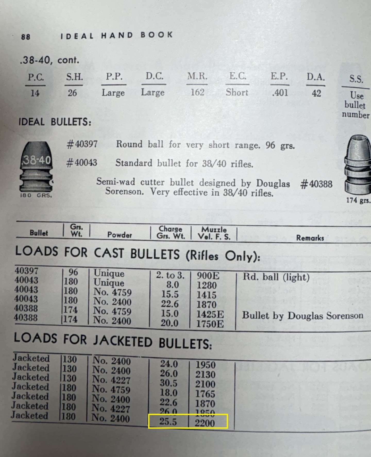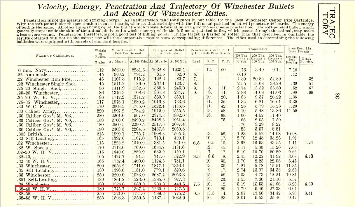 The attached picture is a scanned copy of the October 1911 Winchester Catalog No. 77. I have high-lighted the factory W.H.V. 38-40 load data. The ballistics information was derived using a Model 92 with a 24-inch barrel. My Single Shot high-wall has a much larger (30-inch No. 3 octagon barrel), and a much stronger action. My load does not begin to stress it.