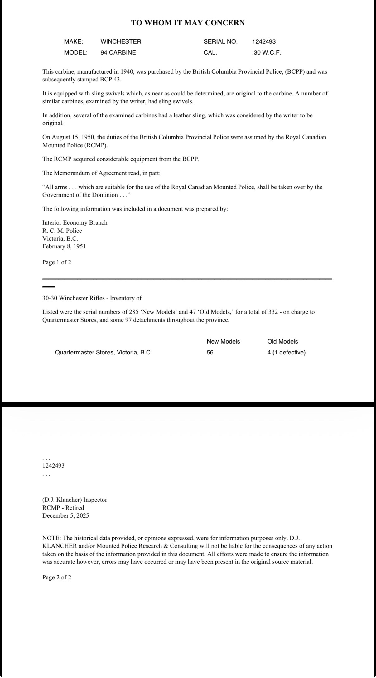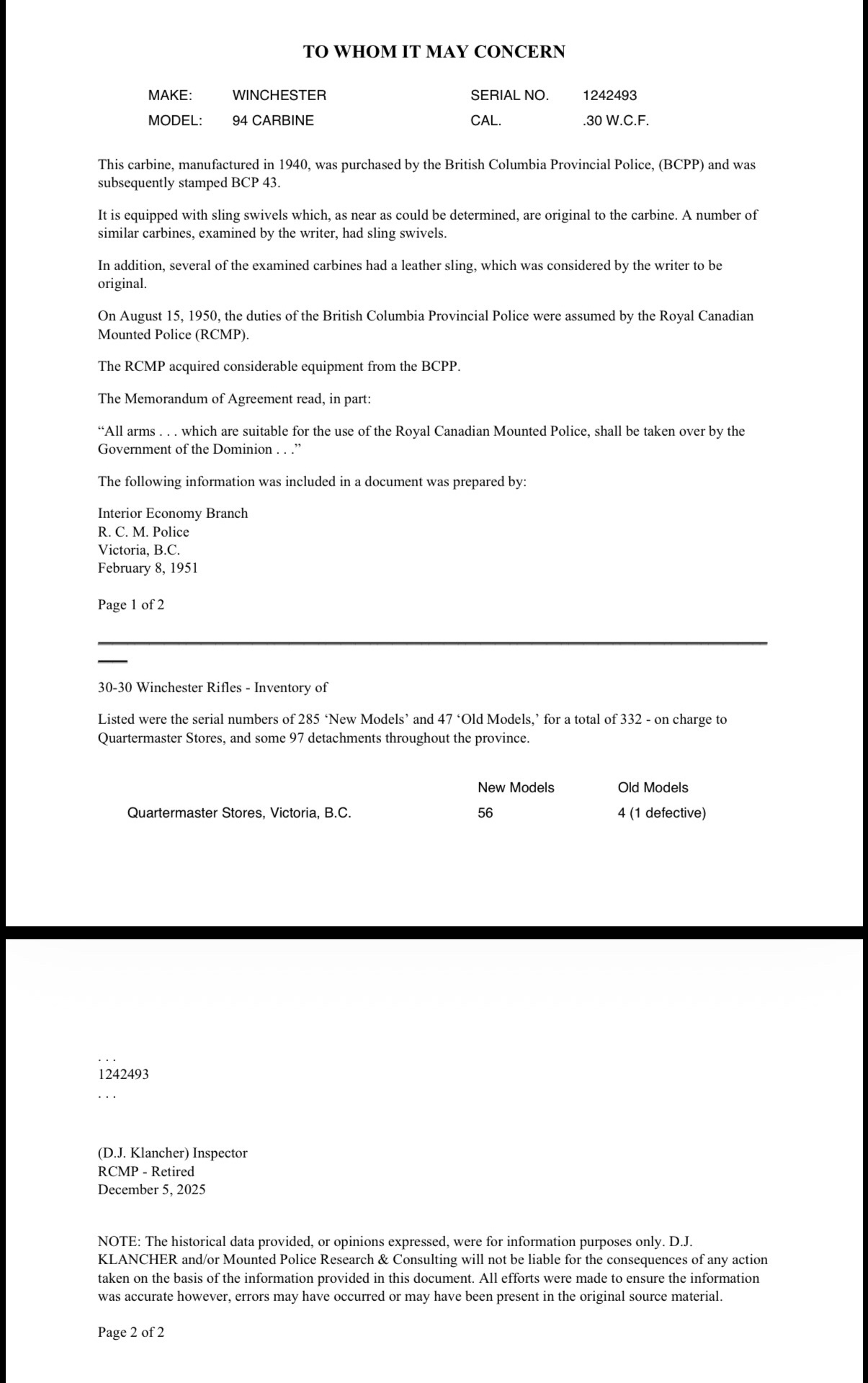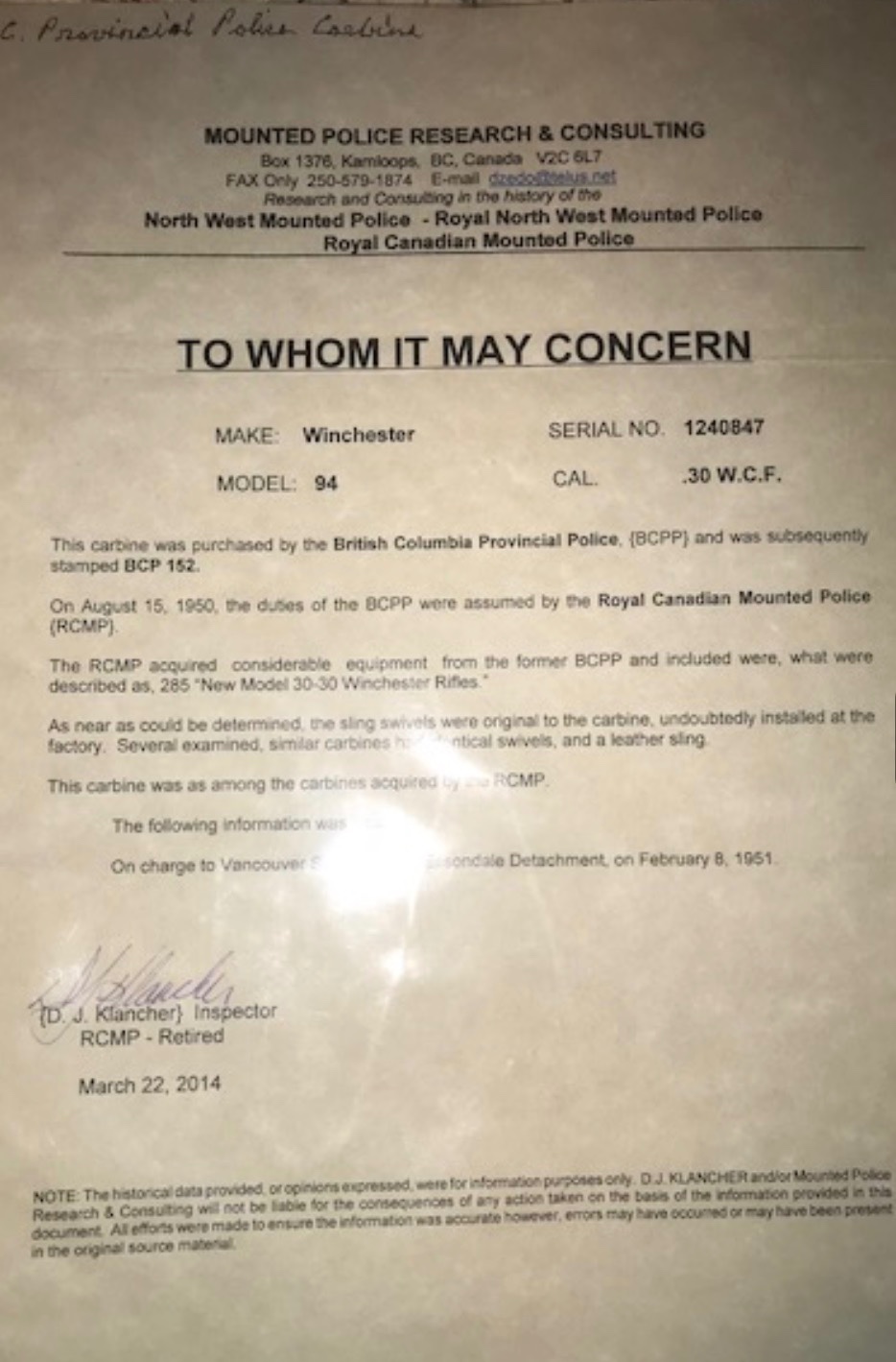 A February 8, 1951 inventory from RCMP Headquarters in Victoria, BC, listed the serial numbers of 332 ‘.30-30 Winchester Rifles’ that had been transferred to the RCMP from the BCP. Of that number, 285 were shown as ‘New Models’ and 47 as ‘Old Models.’