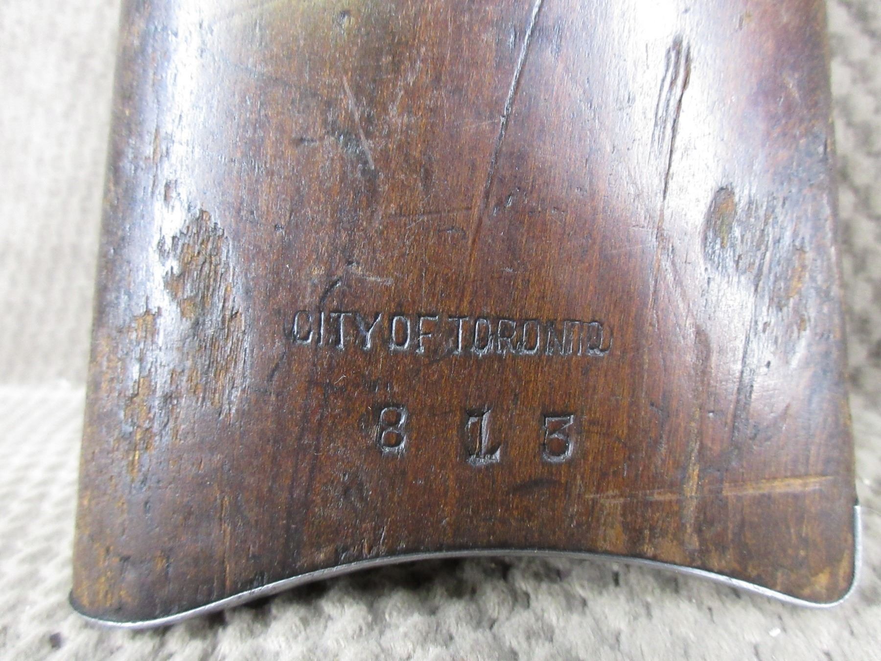 In that 32,877 sample, I have thus far documented (26) Model 1894 Carbines that are marked “City of Toronto”. All (26) of them are in the 688459 – 701182 serial number range, corresponding to production beginning in early October 1914 and ending in early November 1914. All of them are marked on the butt stock in identical or similar fashion to the picture shown below.As of today, I have found them with what appears to be an inventory or rack numbers as low as “26” to has high as “813” which leads me to believe that to total number purchased by the City of Toronto could have been as high as 850 – 900.