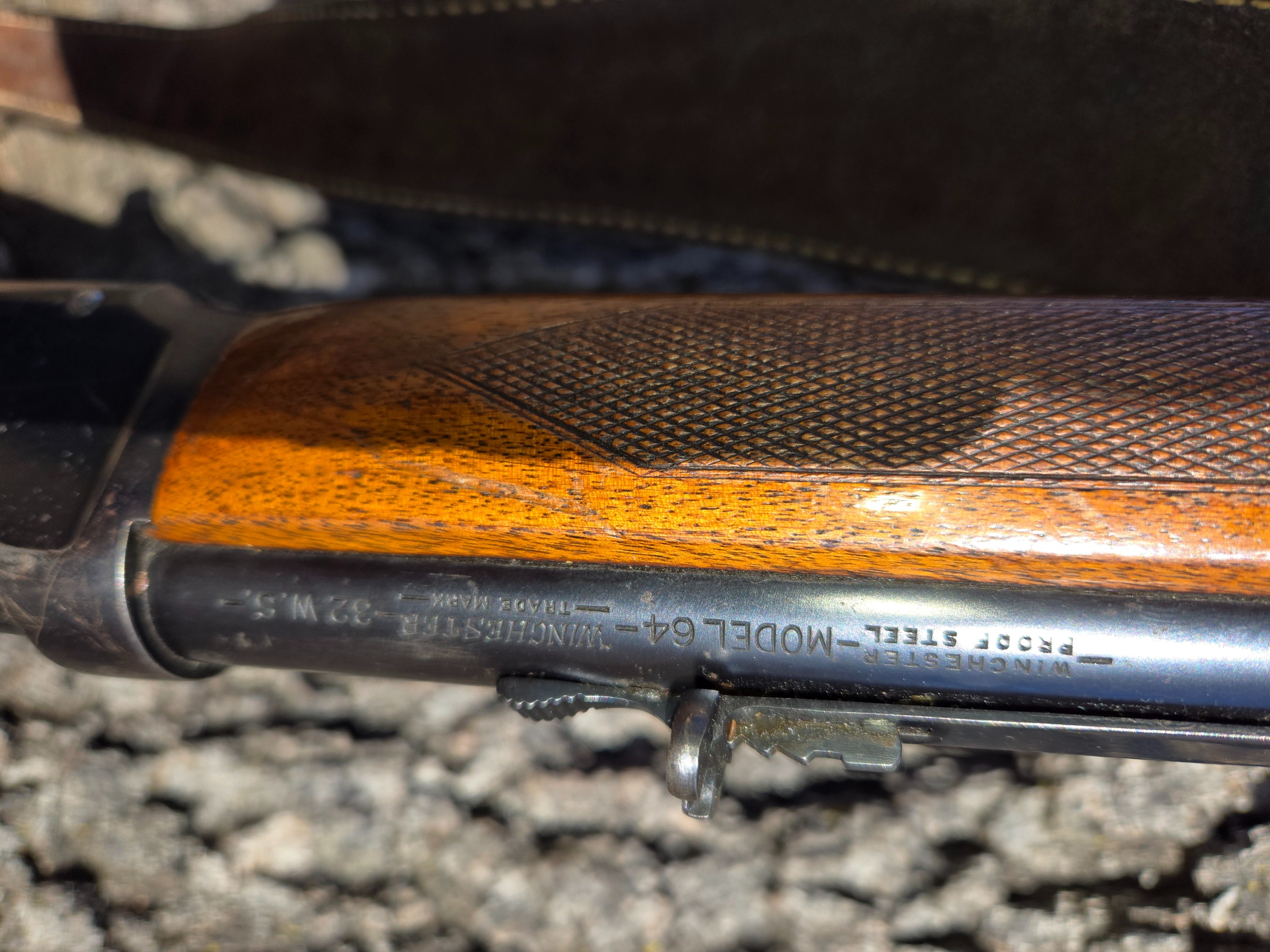 OfflineHere are some pictures of my 64. She definitely worked for a living but is still solid. I took it out today and put a dozen rounds through it and it’s a pretty sweet shooter. Looking at the book again, I was wrong about the forend, it’s the semi-beavertail. It was too stiff to get the forend loose to see the barrel date. I’ll have to get to work with the kroil & ballistol when I have a chance.