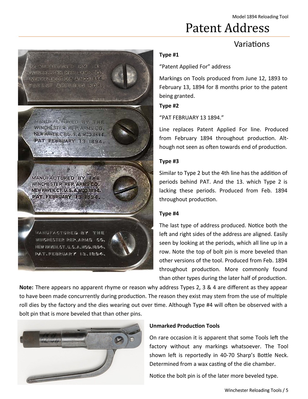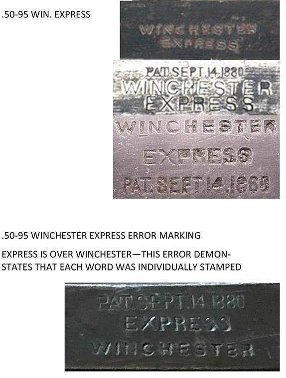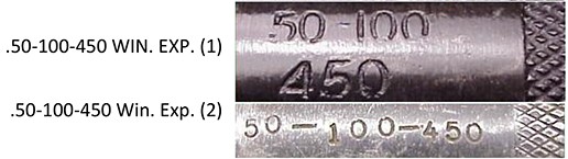 So if you look at this picture. It compares caliber markings for the 1894 Tool Dies of the regular and short range versions. But I’m also looking for specific variations. For example, look at the 30WCF & 30Gov S.R. marks compare to the 32-40 S.R. marks as to their locations. Where the S.R. marking is placed is different.Here is a early DRAFT chapter page for the 1894 Tool regarding Patent Address variations. Thus far I’ve found 5 different types and theorize as to why they vary from one another. I have since learned that the factory also had a “Stamp Book” that may have kept track of such changes in roll die markings. No different that what can be found on Barrel Address markings and Upper Tang markings. So they are not all the same throughout production. Just like with the rifles! Here is a another early DRAFT chapter page for the 1882 Tool regarding Patent Address variations. Not only did the markings change, but where they were placed / located also changed. There are also variations in the types and sizes and shapes of the fonts used. Just like with the barrel markings and upper tang markings on the rifles. Here is an example of the 1880 Tool and how the Winchester Express marking have variations and even errors. Here is examples of variations for the 50-100-450 caliber markings on the 1894 Tool Die.
