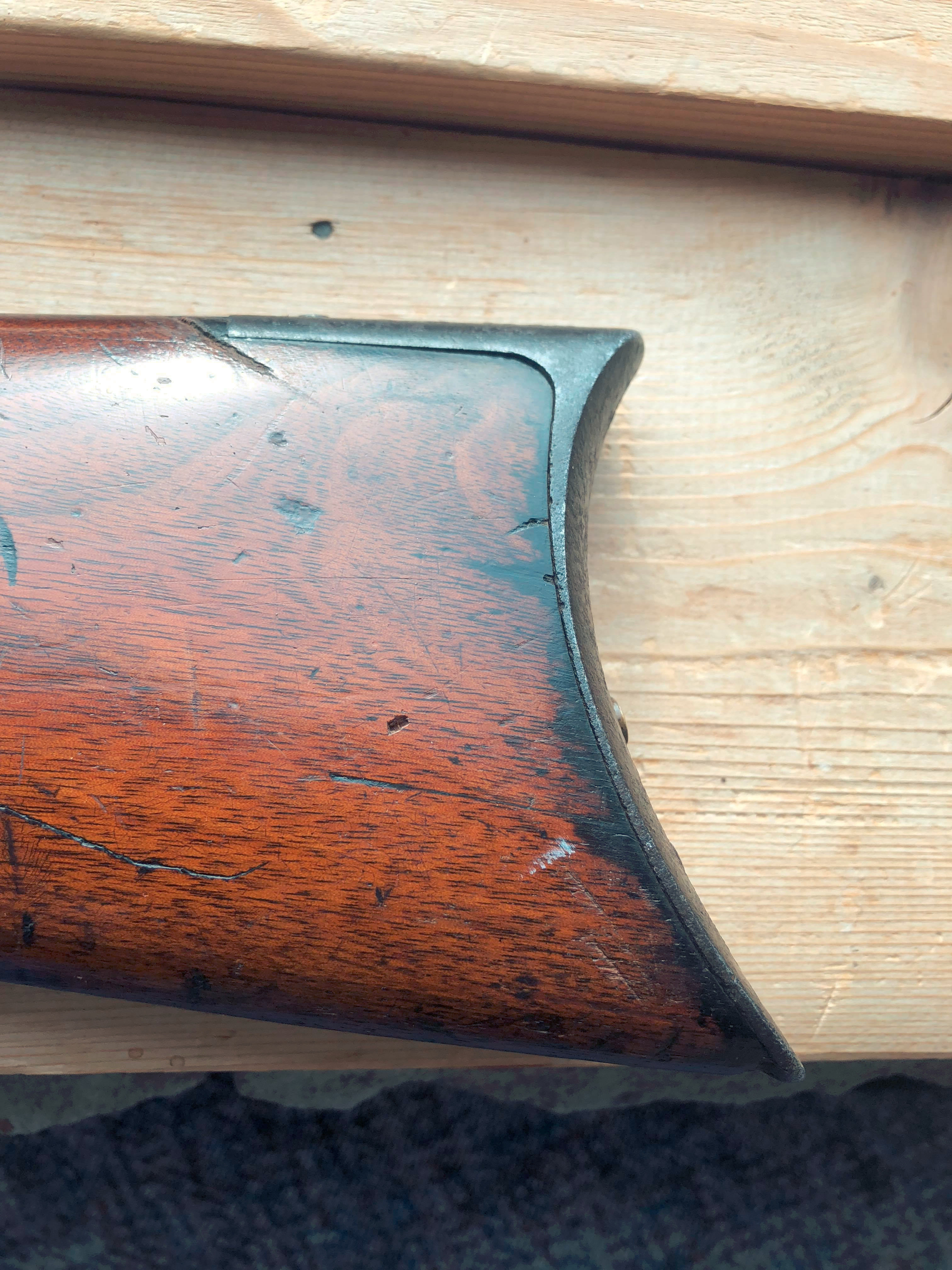 If the forearm is 9 3/8″, its the standard length for a 24″ or longer barreled gun. When they went to a 22″ barrel, they shortened the forearm to 8 3/8″. Your next step is to determine the complete serial number and check it with Cody. My guess if that gun has 22″ barrel it might letter with a barrel longer than 24″ and was shortened or someone changed the barrel.