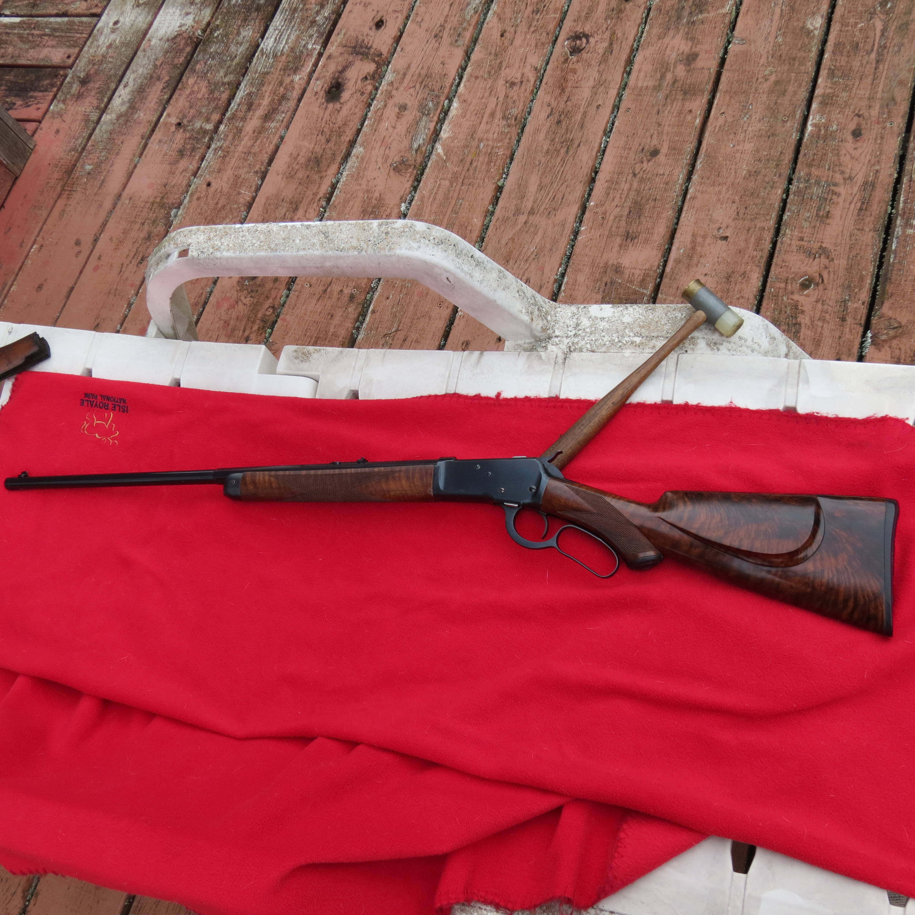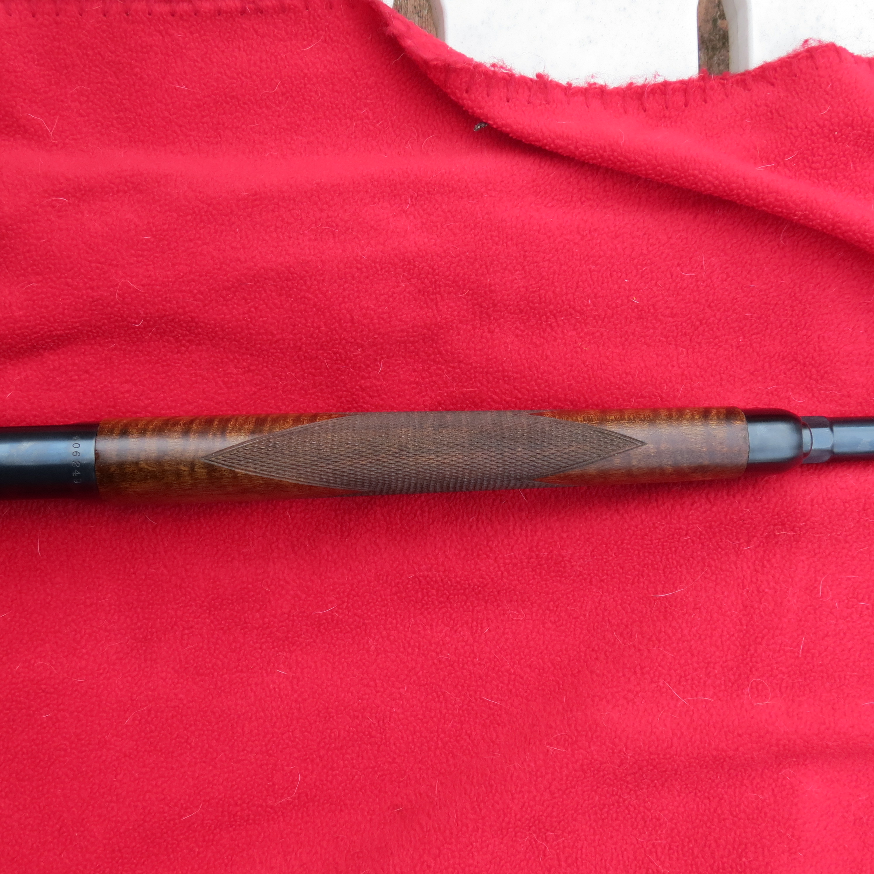 OfflineI found this old girl at a local gun show 5-6 years ago. I have a before picture on another computer I can post on Monday. It was in a non operable condition being, the operating lever was bent badly enough the action would not lock up properly. There was not a trace of blueing left on it with the exception being under the forearm wood. The original wood had been “refinished” at some prior time and enough wood had been removed that all metal contacting it was protruding substantially. The original butt plate was broken with pieces missing and the grip cap suffered from the prior refinishing. The original forearm was given a home checkering job with what appeared to be some type of veining tool. It was at least 4 lines per inch and an 1/8 in deep. Salvaging the original wood was out of the question. There is a pic. of the original butt stock in the second to last pic.
