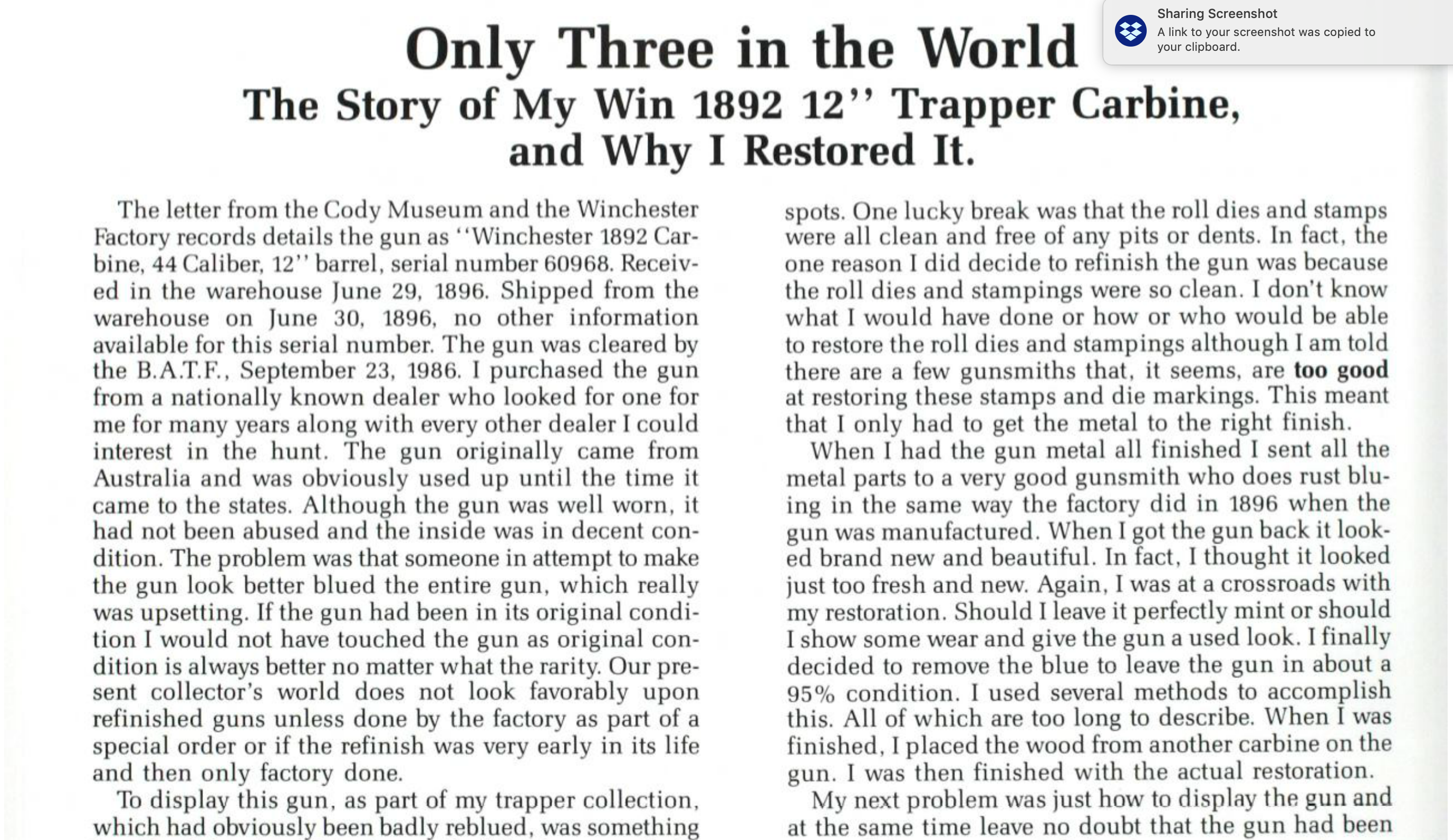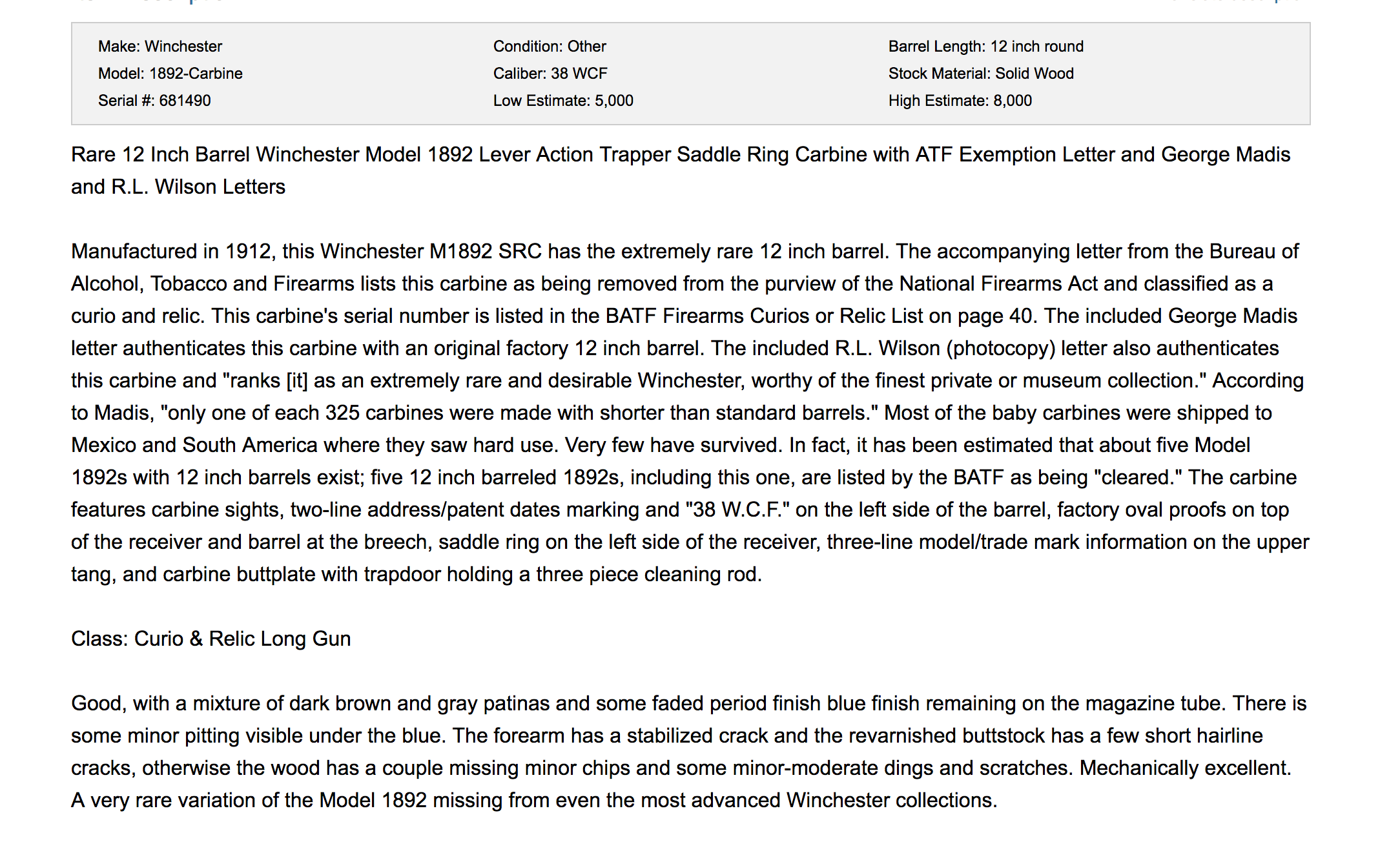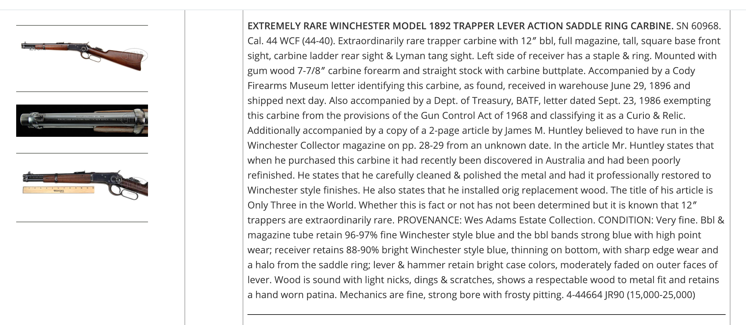 OfflineI agree. I have been buying, selling, trading Winchesters for 60 years. For most guns comparison shopping is available. Going to guns shows and talking to other collectors who buy and sell similar guns. And now sales on the internet. A 12″ 1892 is a rarity. I have never seen one in person or known anyone who had one. Now I have a few sales to refer to. The value is not definitive, but at least I have some information to work with.