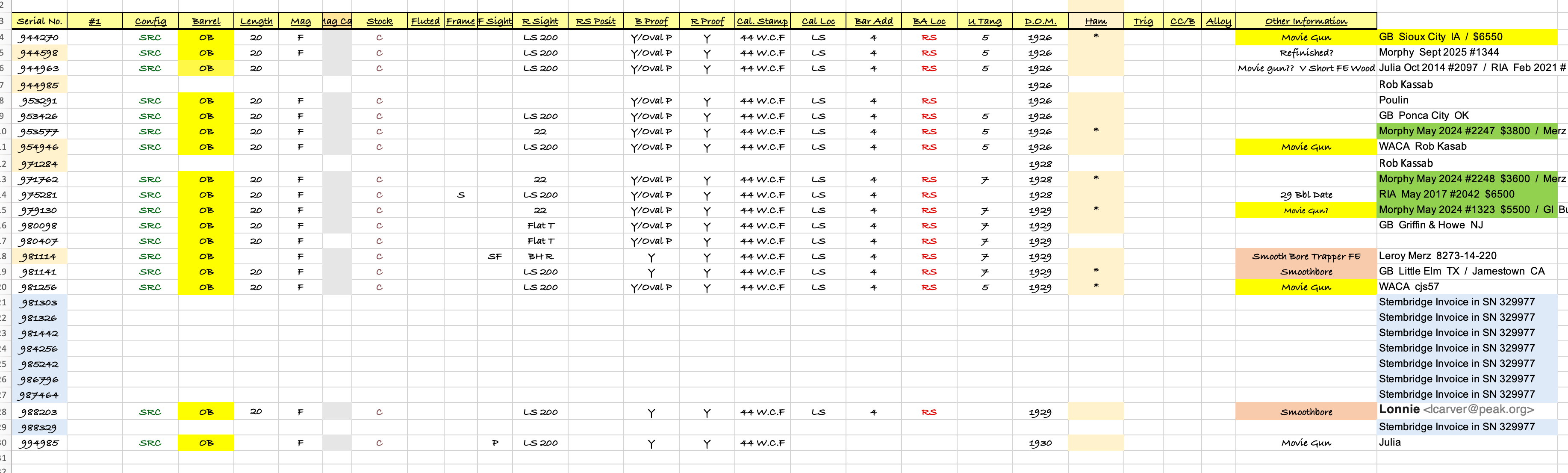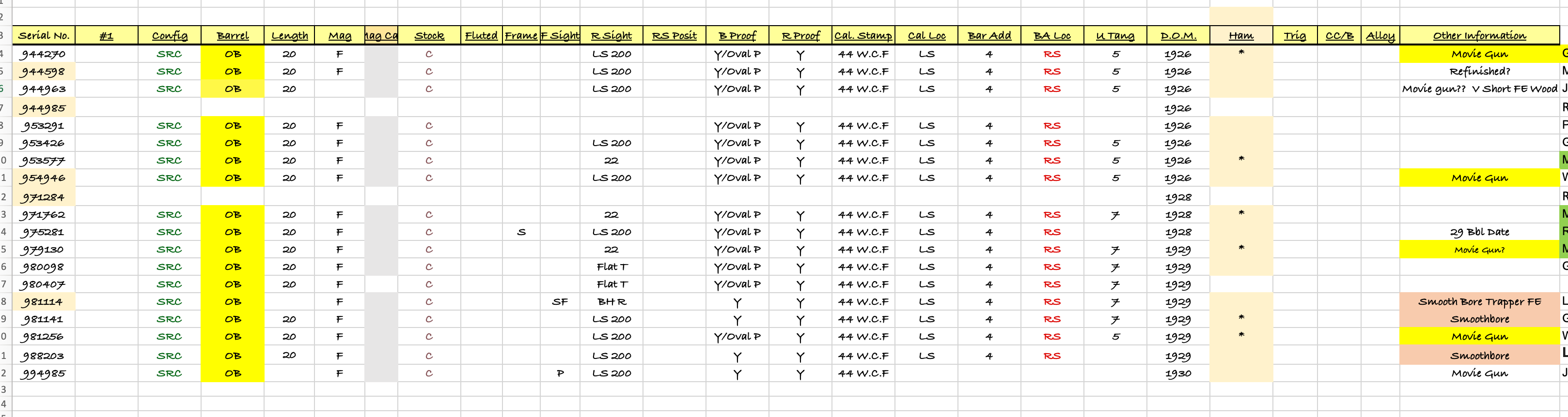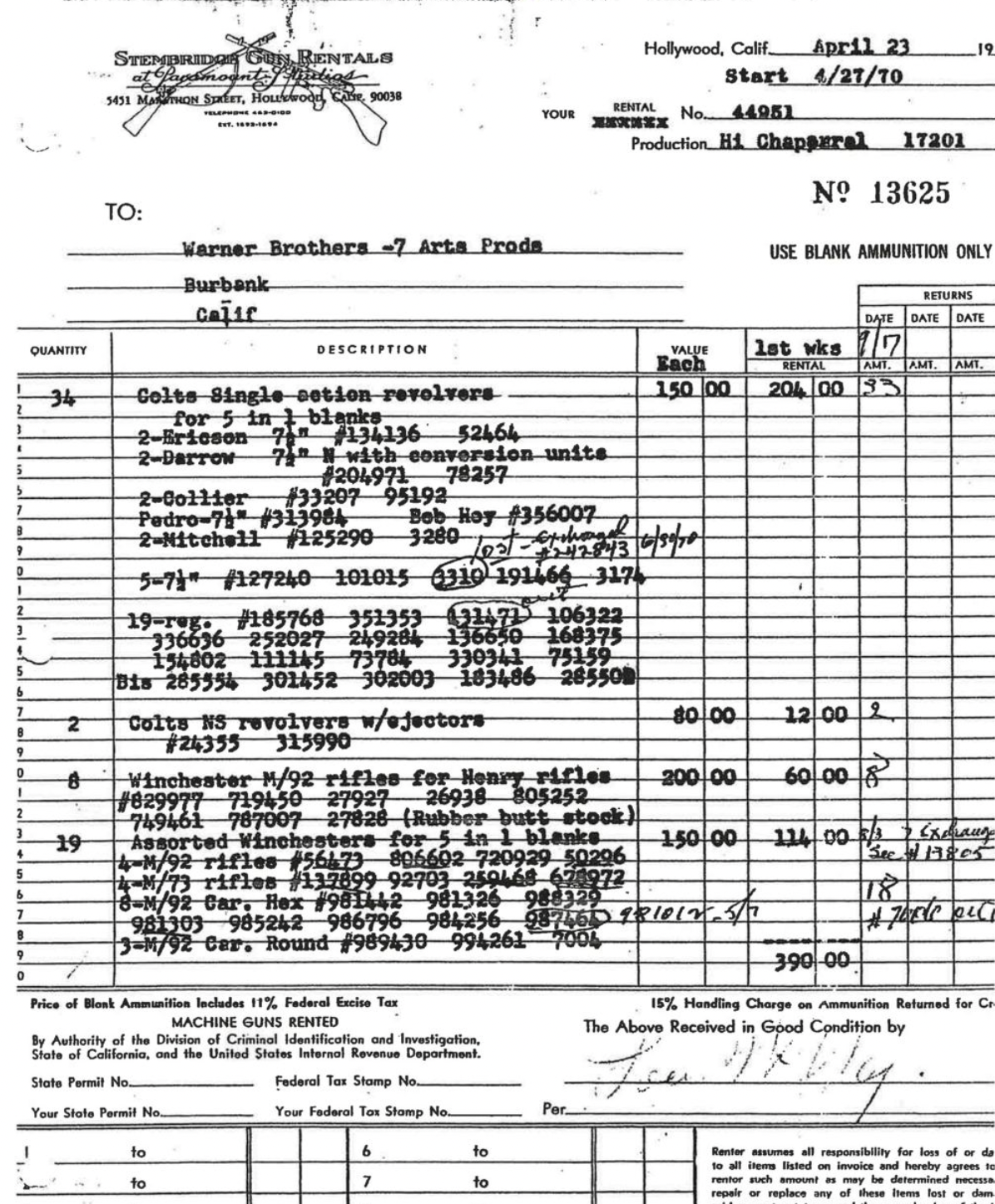 In addition to the rifles identified by Ron Kassab (shaded SN’s) I have cataloged an additional 17 identical examples. I do not have any images of Ron’s SN 944985 and 971284 examples. Additionally I have no image files for SN’s 954946, 981114, 981256, and 994985. If anyone has one of these rifles I would love for you to contact me so that I can get a bit more info. It is interesting that the three Smoothbore examples do not have the Oval/P proof stamps on the barrels. The blue shaded serial numbers are added since these rifles show up on a Stembridge Gun Rentals invoice from 1970 that I found when a different rifle was being being auctioned off and has the SN’s listed a Car. Hex configurations. See the listing opposite the “19” near the bottom. These rifles were being rented out to Warner Bros 7 Arts Prod. for the TV show High Chaparral.