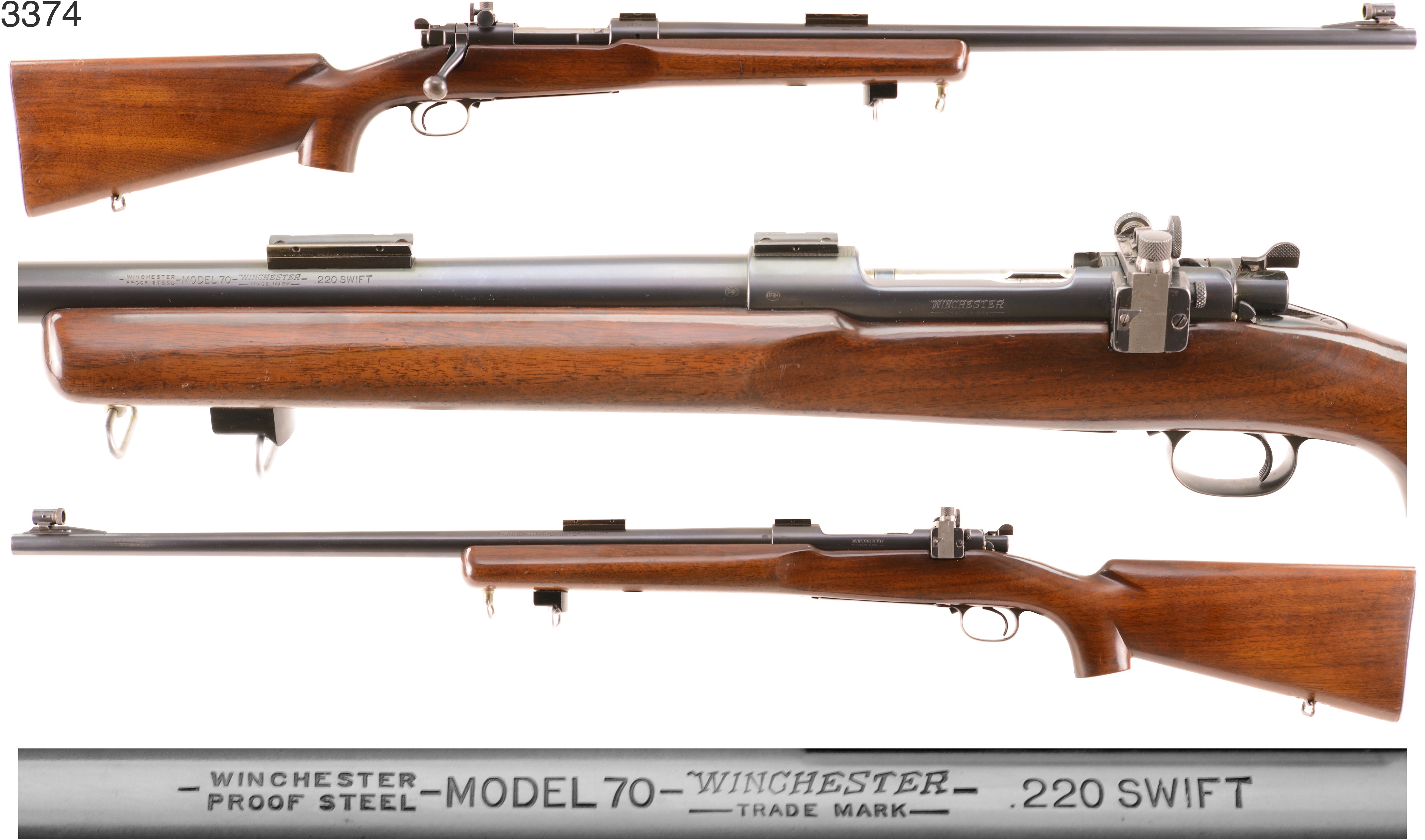 Here are pics of two 220 Swift Target Models for comparison, a 1st Variation (s/n 3374) and a 2nd variation (s/n 250764). Both have all the parts on them that came from the factory (except the slings that were removed for pictures).