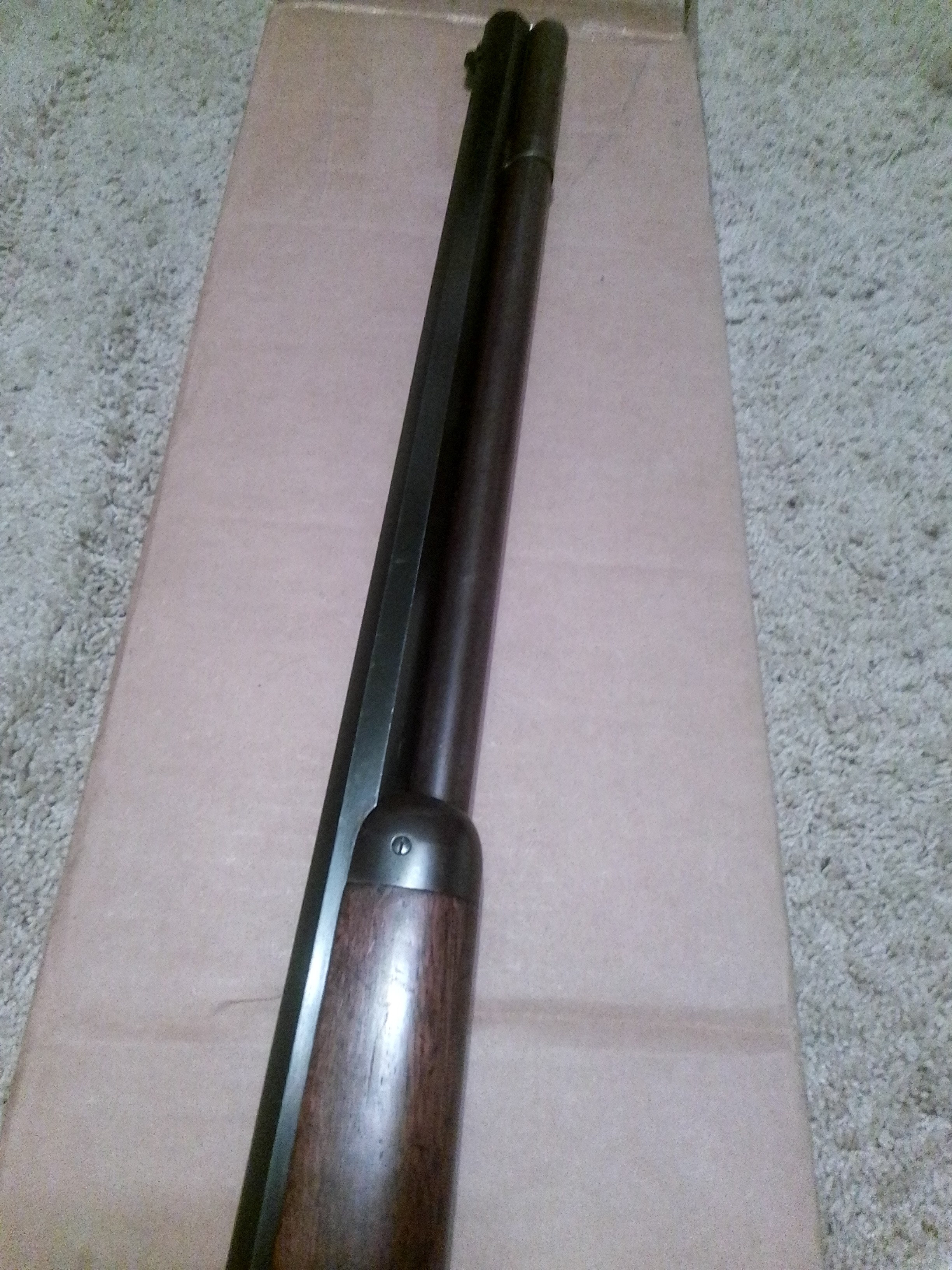 OfflineYes sir. What I know. Rifle was advertised as original blue. Front sight replaced at some point with redfield sight. I’m still learning but, on one hand it does look original finish. Tried the flash light trick on barrel and it does show some rust, brown reddish color. But faint. Looks like at some point the rear sight was knocked, not sure if it was removed or adjusted for windage. The flat of barrel muzzle could have minor blue. Or maybe old black powder burn? The magazine tube has aged differently from barrel more patina. Stocks seem like good fit, everything is tight and good mechanics. Roll marks look pretty good and appear to have not been blued over. S/N 8855. I tried to post pics but bad light and bad photographer. Bore very good and shinny. Bye the way I love your research on the 94s. Got my eye on s/n 498 on r.i.a Dec. 6th. Auction.