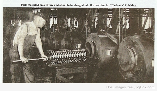 OfflineThanks for posting this, as this is the first photo of the rotating ovens I’ve seen. In another discussion of the process, someone who appeared to know what he was talking about said that the color produced on the steel was a temper blue, the main purpose of the charcoal & oil being to exclude oxygen from the chamber by converting it to carbon dioxide. That explanation is somewhat at odds with these statements: “Carbonia…is a combination of heating oxidizing and carbon impregnating, not carburizing.” “6. The work is tempered and given a carbonia finish simultaneously…” What I’d like to hear is a metallurgist’s explanation of the chemical processes at work in the oven.