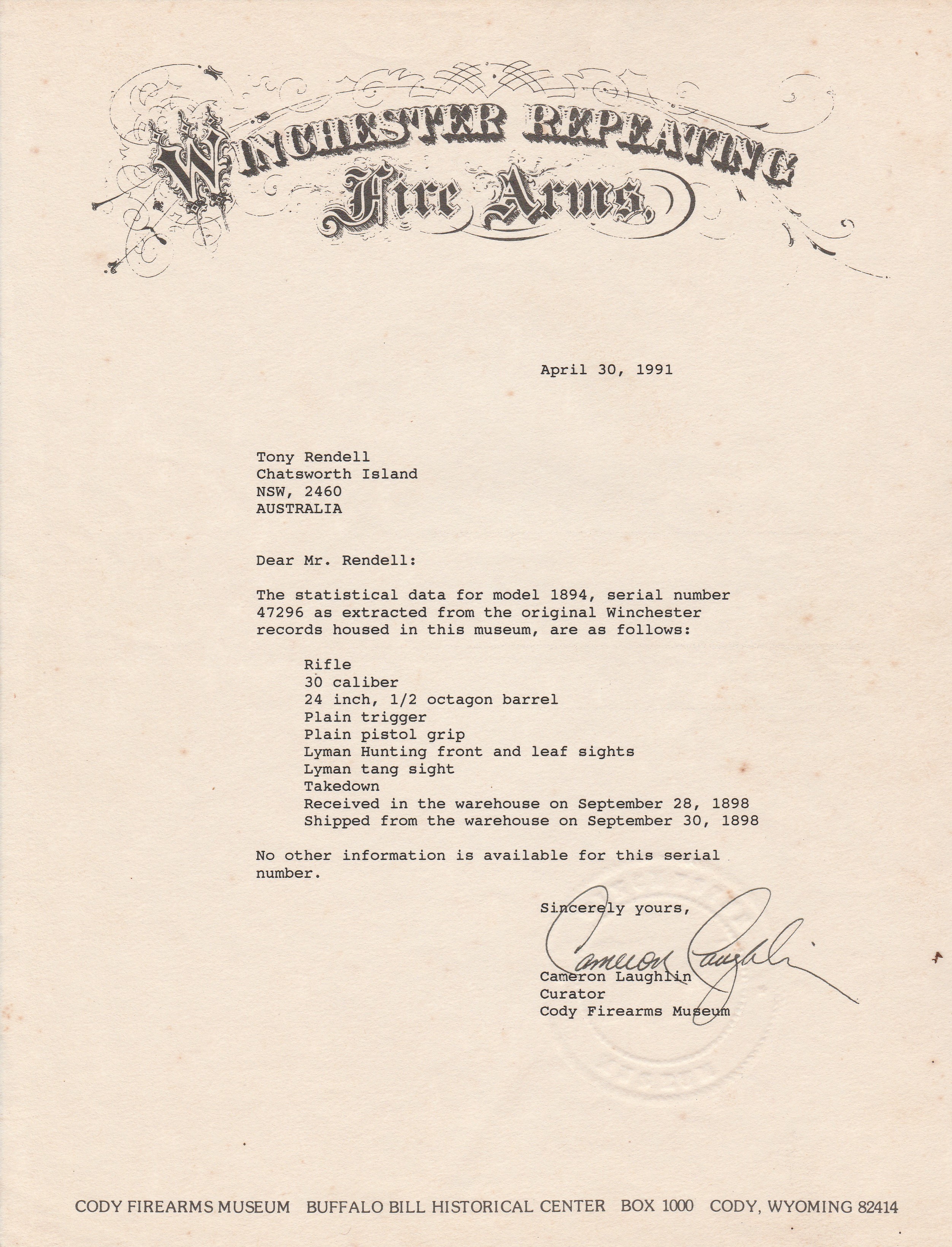 OnlineI have a letter from the Buffalo Bill Historical Center dated March 13, 1978. It is non embossed Richard Rattenbury signed. So I guess the letters were from Winchester, then Buffalo Bill Historical Center, then Cody Firearms Museum and the only letters that are embossed are those from Cody. Just a guess based on my letters, I’m sure someone has a better handle on this than me. T/R