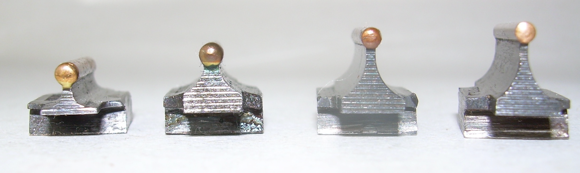 Second from left… Prior to 1952, Model 70 Super Grades with standard contour barrels used the 0.310″ tall Redfield 254 full gold bead, just as Standard Grade rifles used a 0.310″ tall silver (tinned) bead Winchester 103C… After 1952-53 this changed to a 0.360″ tall Redfield 255 (third from left) or Winchester 103E…