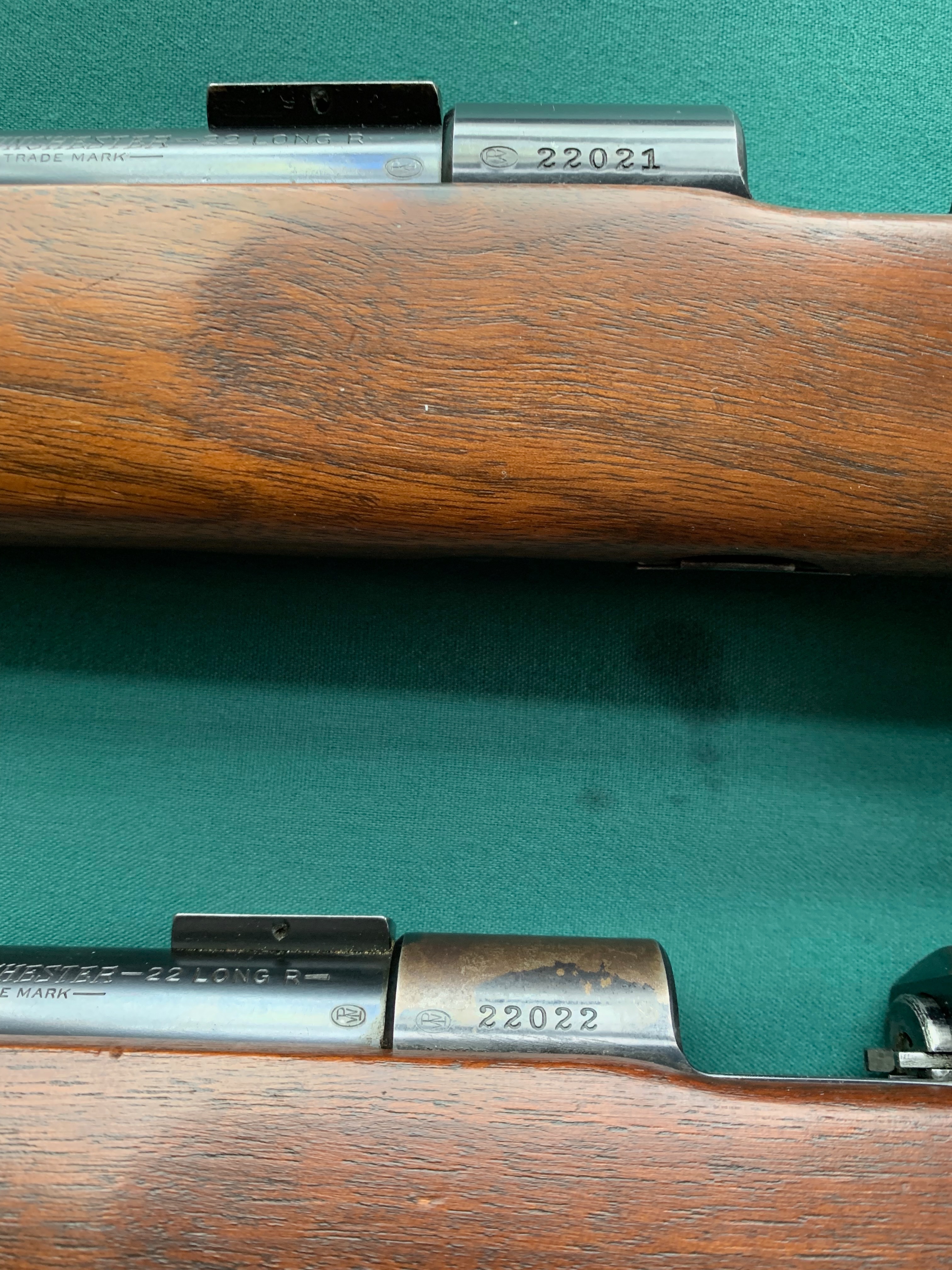 The strange thing about my two consecutive pairs is that I purchased each of the four rifles separately —- they were in four different states —- and over a period of not less than 20 years from first rifle purchased to the last rifle purchased. I didn’t set out to purchase a consecutive pair, but ended up with two such pairs. Since my brain often recalls truly odd information (like serial numbers) I was able to recognize these Winchester 52 rifles as the “mates” to rifles I already owned. Then I felt obliged to buy the rifle for which I had the adjoining serial numbered rifle.