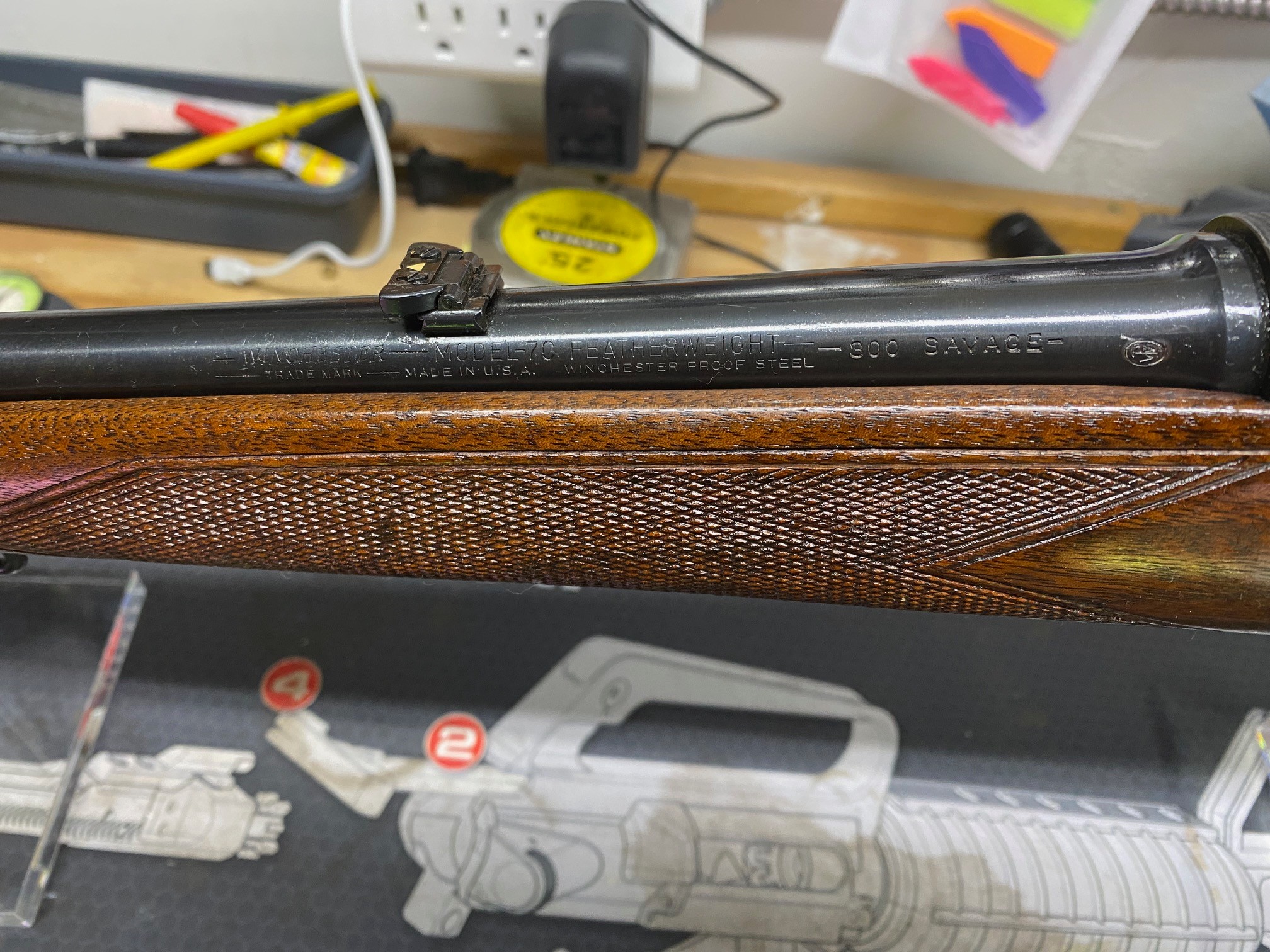 Also… While the factory drawing of barrel inspection caliber stamps says 300 SAVAGE barrels should be marked “300S”, I’ve yet to run across one. The legit (and undoubtedly some fake) 300 SAVAGE Standard contour barrels I’ve gotten pictures of are stamped “300-SAV.” under the barrel.