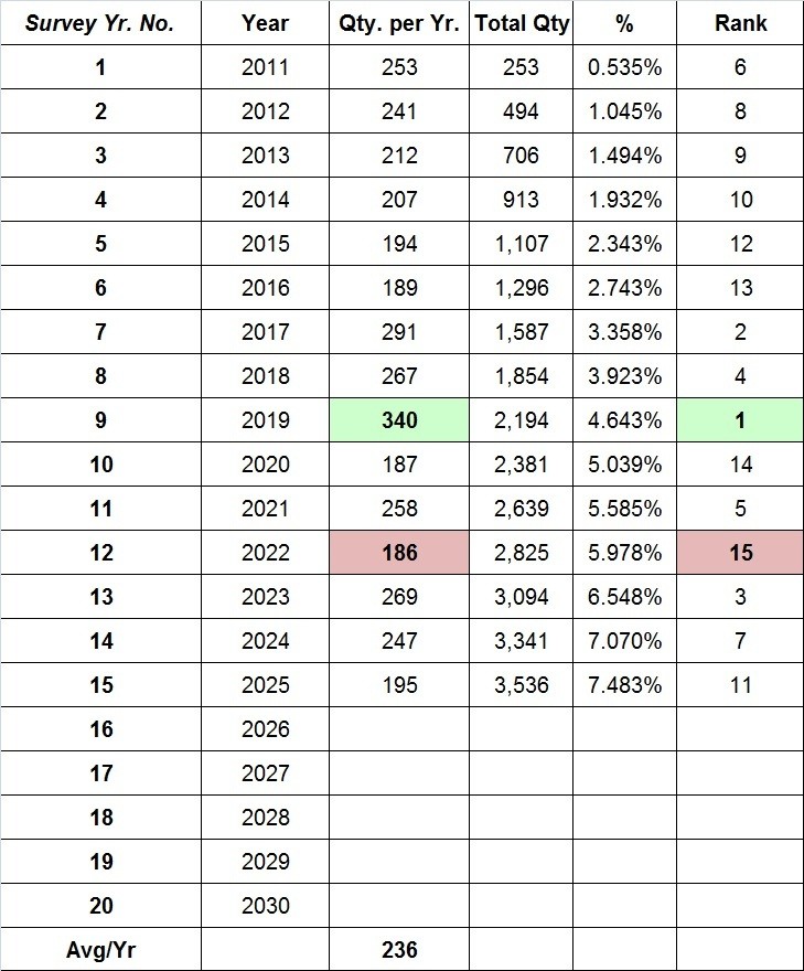 It would be really nice to reach my goal sooner but based the first 15-years that the survey has been in progress, I am averaging just (236) new entries per year. At that pace I will reach 4,725 (10%) by the end of the year 2030. I actually created a table in my survey document to track how many new entries I have made each year.
