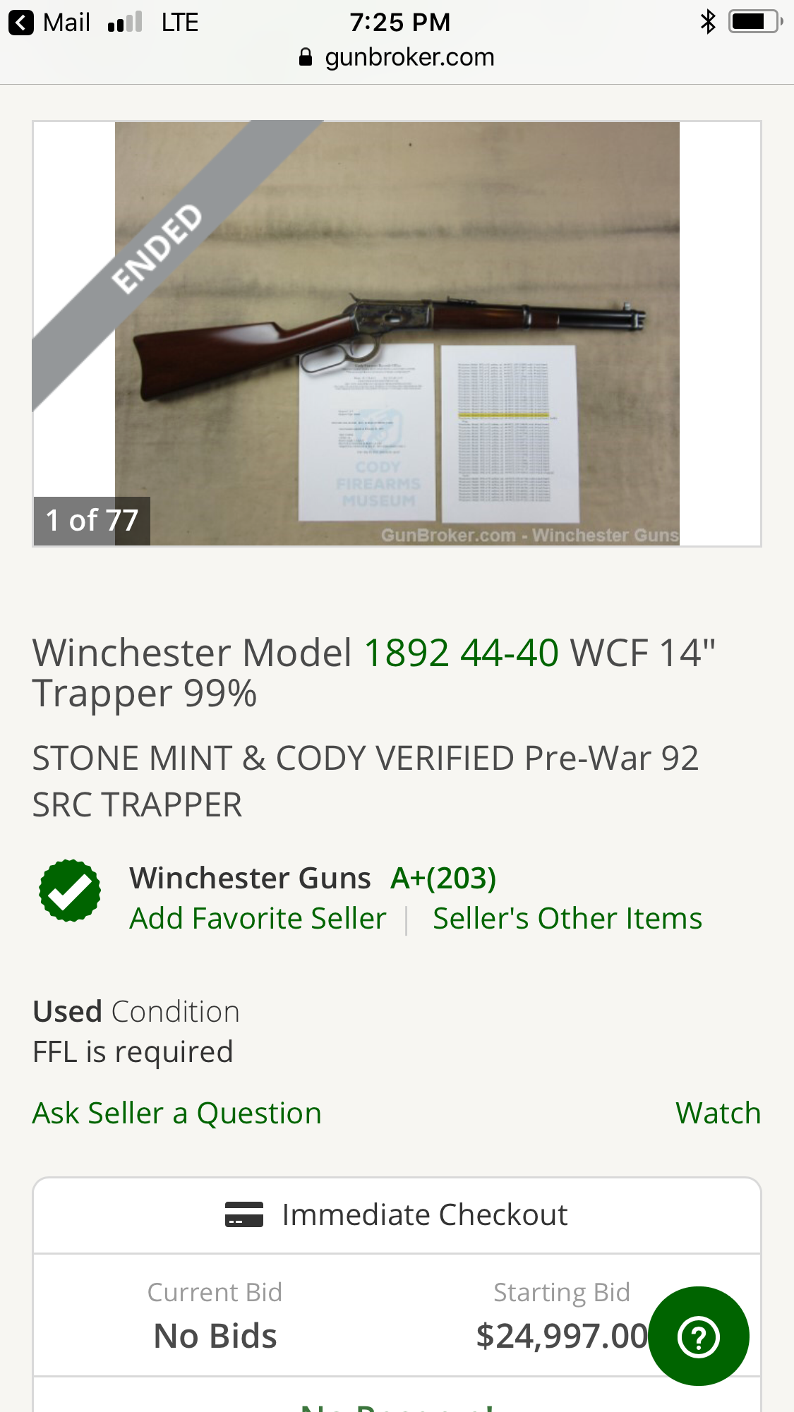 OfflineBert, The seller has about 20 repete customers he gives first shot at before he starts the auction. These guns did sell before the auction started. Some time ago I purchased a couple 42s from this seller. I contacted him to inquire about any other Winchester’s he might have for sale. He told me he had around 600 in his fathers estate and he picked up a half a dozen each week to sell. I told him I would fly to California to take a look but got put off. He said he would put me on a list so I could view the guns before the auction and if I seen something I wanted it was first come first serve. I still get emails each week on the guns pryor to listing.