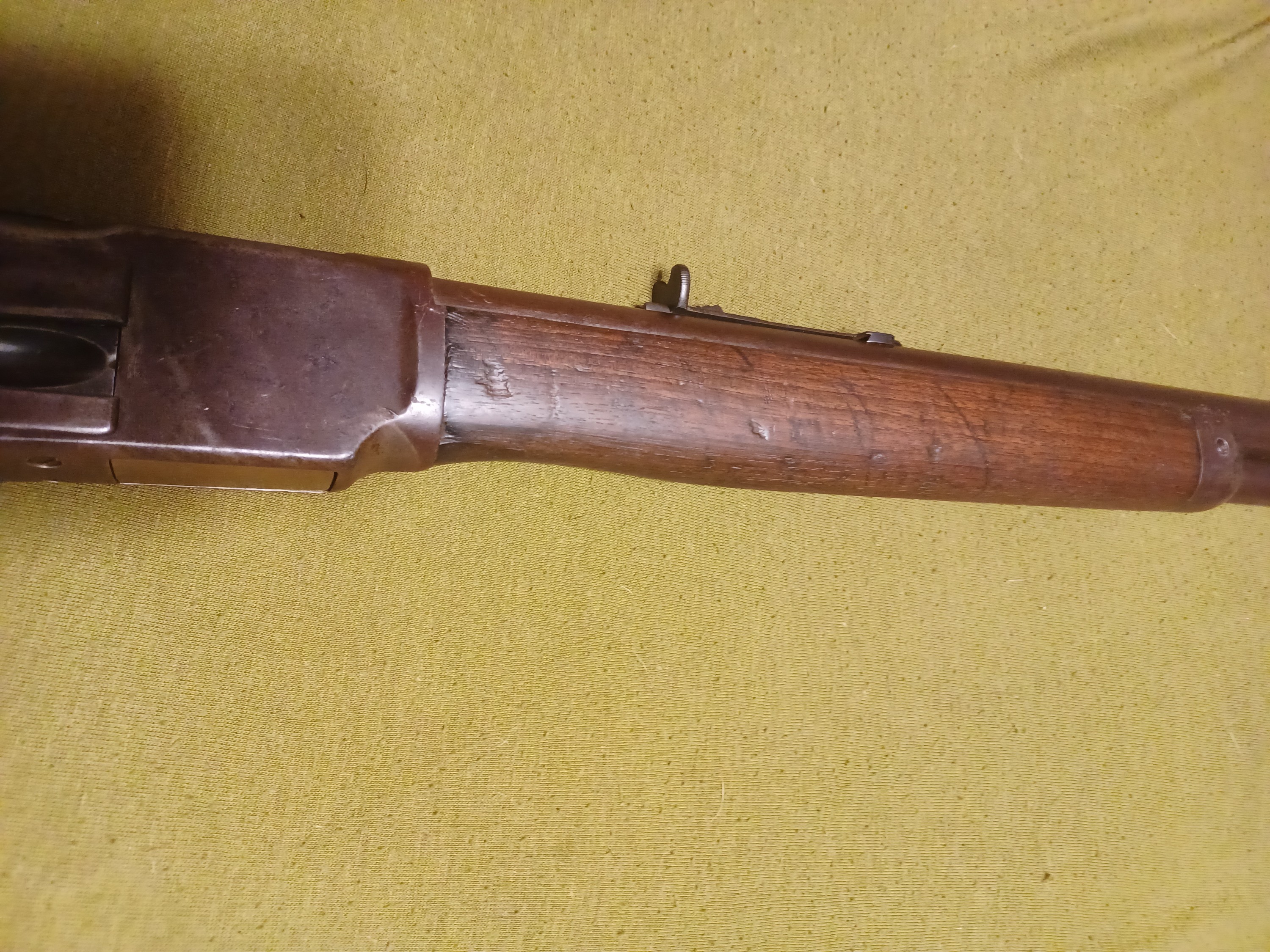 It truly is beautiful to me. And it definitely had a life in its early years. All internal parts are there, it is missing the dust cover. I found it at a garage sale. I’ll never forget. The guy said he had a few guns he inherited from his father, he took me into his home and opened a safe, pull out a old bolt action shot gun I took it looked and set it down. Next he pulled out a marlin model 1894. I was holding it when out of the coner of my eye I seen the 73 come out of the safe. Now I’m having to control myself. He told me his dad bought these guns at garage sales in the St. Louis in the 1960s. And never did anything with them. The rifles looked like they had sat around in a closet for the last 90 years. There was also a model 43 spanish mauser In 8 mm. Turns on the mauser is pretty rare. It’s a civilian model in excellent condition. The marlin is 32-20 mfg. 1905. The 73 is 44 mfg.1885