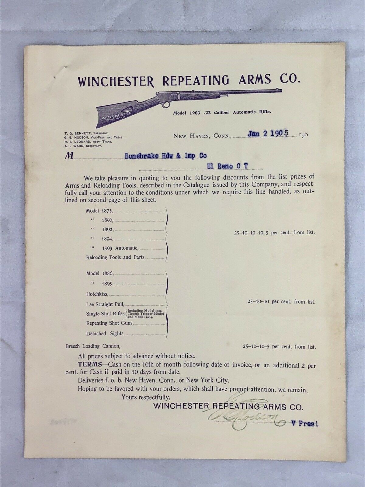 This January 2, 1905 factory dealer discount letter is an example of what I’m talking about. I may be wrong again, but I think this reads as a 25% discount on the Model 1873, 10 % discount on the other models and a 5% discount on reloading tools to factory authorized dealers.