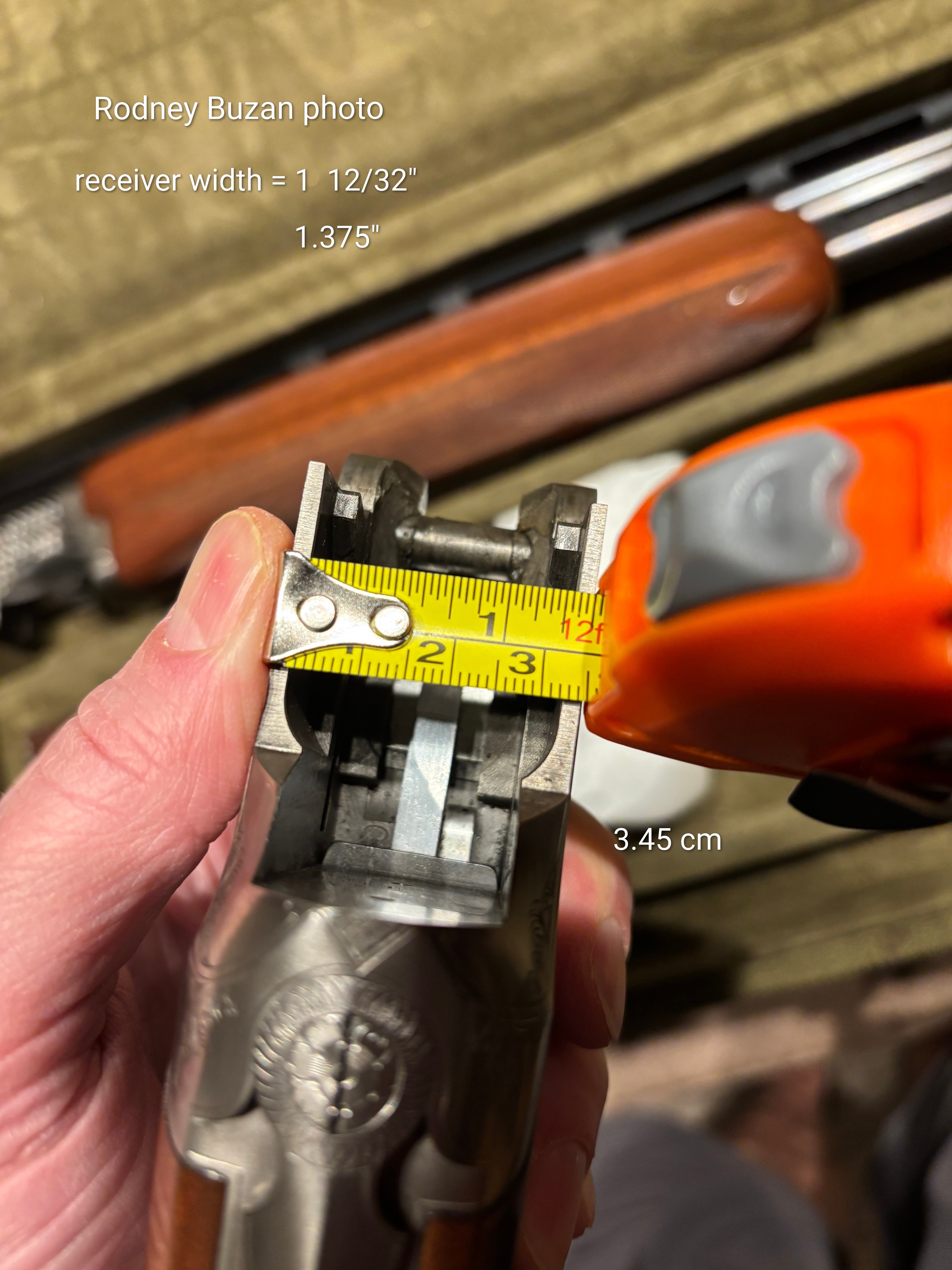 With the barrels off, measure the width of the receiver at the point shown. The Standard receiver is approximately a quarter-inch wider.