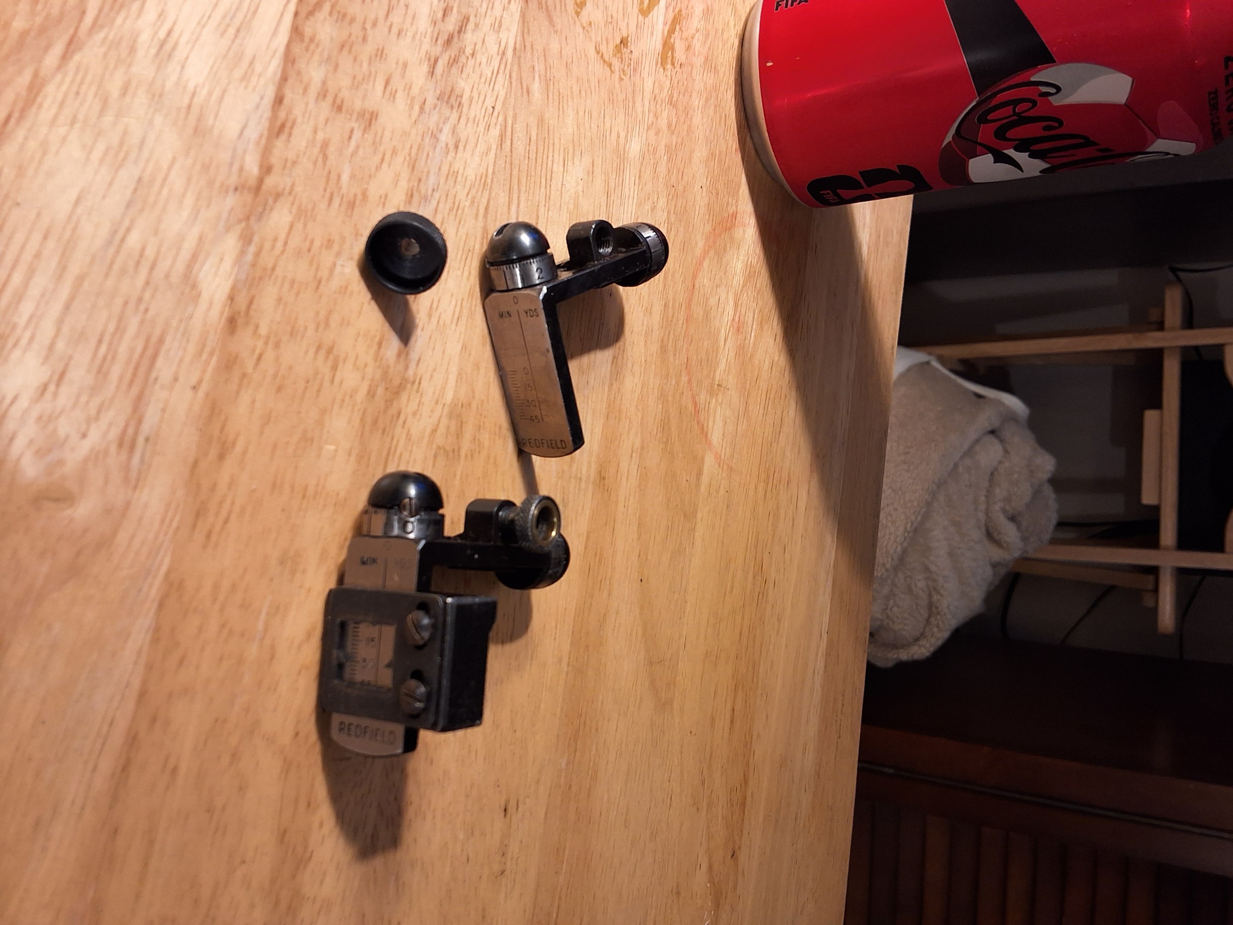 Today, preparing a Stevens bolt action 22 as a gift, after fitting it with a Lyman 57 and a 3/32″ ivory bead and installing a blank in the rear barrel sight seat, I screwed such a pinhole aperture into a surplus sight bridge i use as a fixture, clamped it into my drill press, and enlarged the pinhole to 0.120″ with a #31 drill bit.